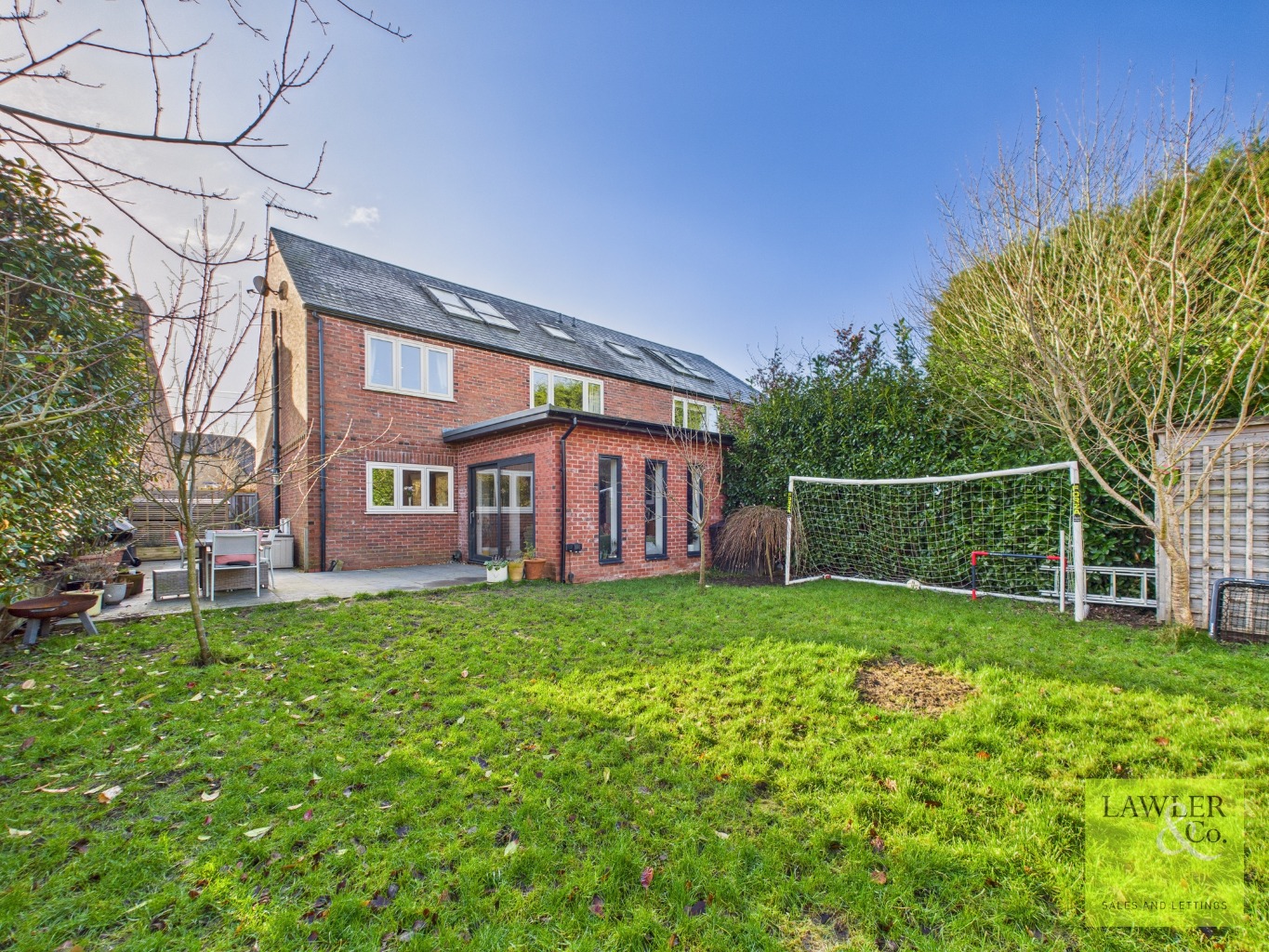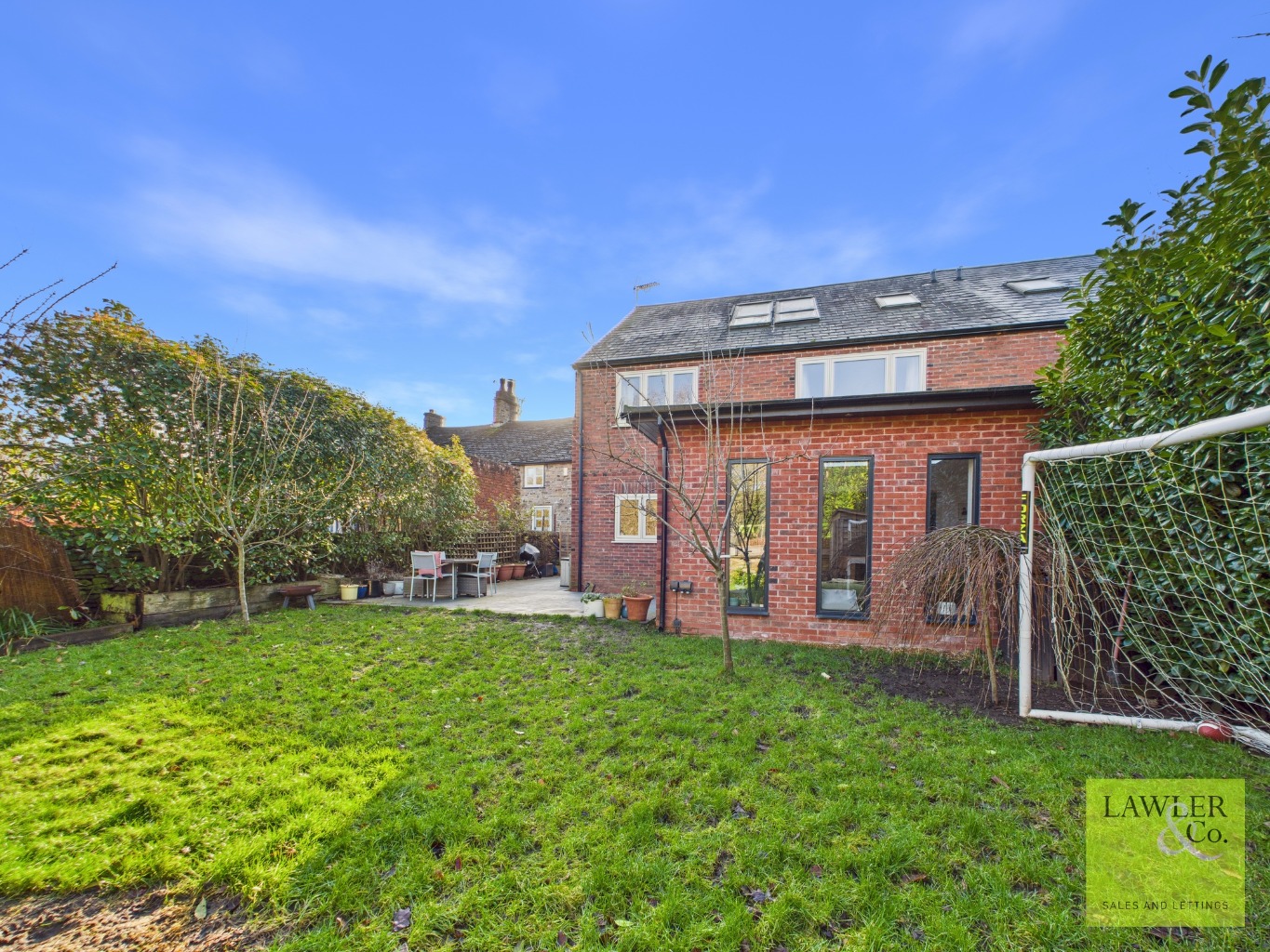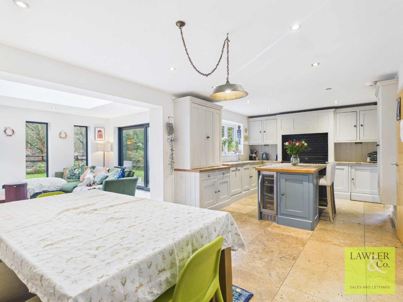 Upon entering, you are welcomed by a bright and spacious hallway which leads through to the generous yet cosy living room, featuring a charming log burner with attractive stone and brick surrounds. The impressive open-plan kitchen/diner forms the heart of the home and boasts a central island complete with storage, a wine cooler, breakfast bar, and attractive oak worktop. Quartz worktops sit atop matching wall and base units, complemented by a Belling electric range oven with gas hob, Bosch dishwasher, integrated fridge and a characterful Belfast sink overlooking the rear garden. Attractive stone flooring completes this beautifully designed space. There is ample space for dining, which flows seamlessly into the modern and stylish extension, currently used as a snug. Exposed brickwork adds charm and character, while a large skylight floods the room with natural light. Sleek sliding doors open directly onto the rear garden, creating an excellent indoor-outdoor feel. A useful utility room provides space for appliances including a washing machine, dryer and fridge/freezer, with a patio door offering access to the side of the property. A spacious and versatile study offers flexible use as a home office or additional living space. Completing the ground floor is a convenient WC, finished with attractive stone flooring.