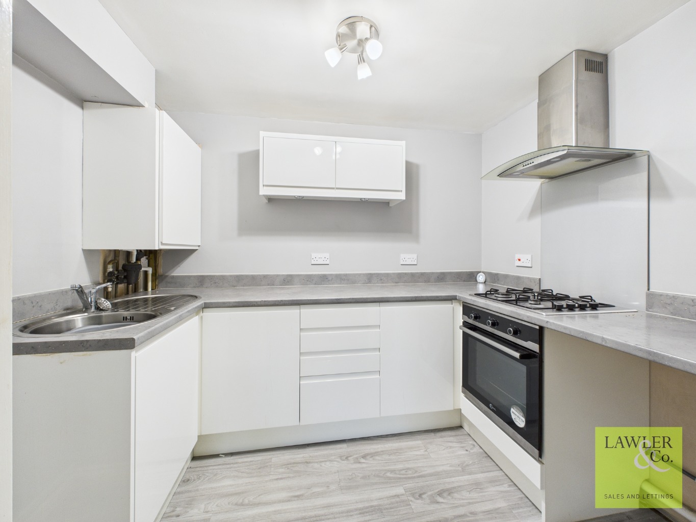 The bright and spacious living room benefits from French doors that flood the space with natural light while providing direct access to the front aspect and garden views. This inviting reception area opens seamlessly into the kitchen, creating a sociable and flowing living space ideal for both relaxing and entertaining. The kitchen is well fitted with ample cupboard storage, an integrated oven and hob, and space for white goods.