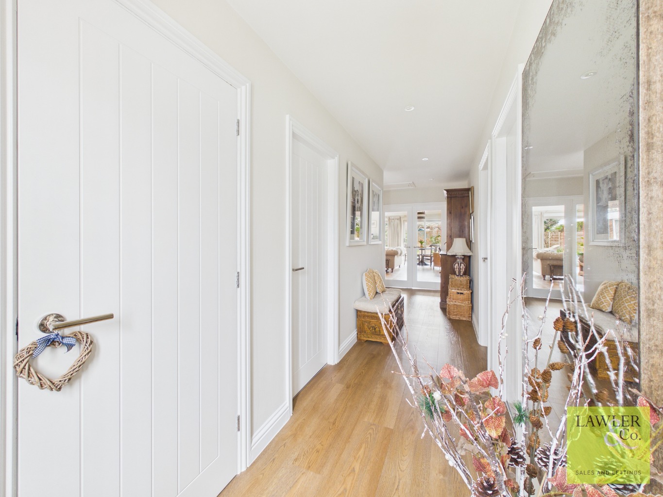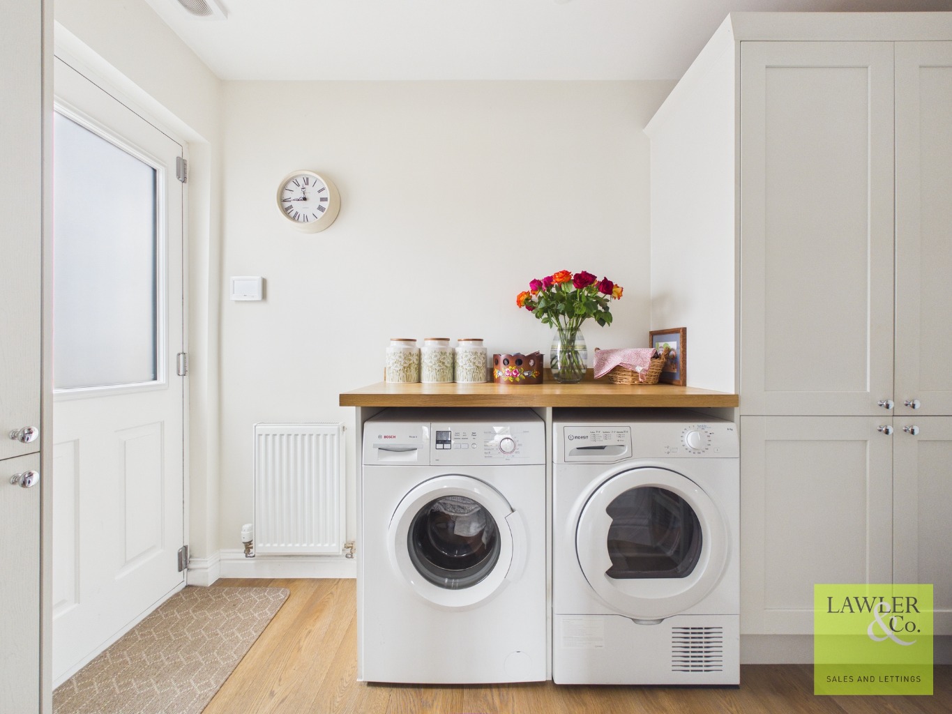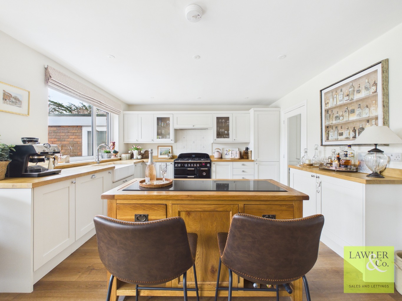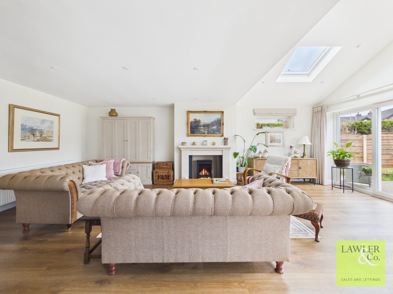 Double doors open into the impressive open-plan living, truly the heart of this exceptional home. Flooded with natural light from Velux windows and dual sliding patio doors opening onto the decking, this stunning space is perfect for both everyday living and entertaining, ideal for enjoying the warmer spring and summer months. The living area is centred around an inviting gas fireplace with an elegant mantelpiece surround. The contemporary kitchen offers a range of stylish eye and base level units alongside integrated appliances including a fridge, freezer, dishwasher, dual sink and range cooker with extractor over. Further complimented by a separate utility room providing additional space for white goods and convenient side access.