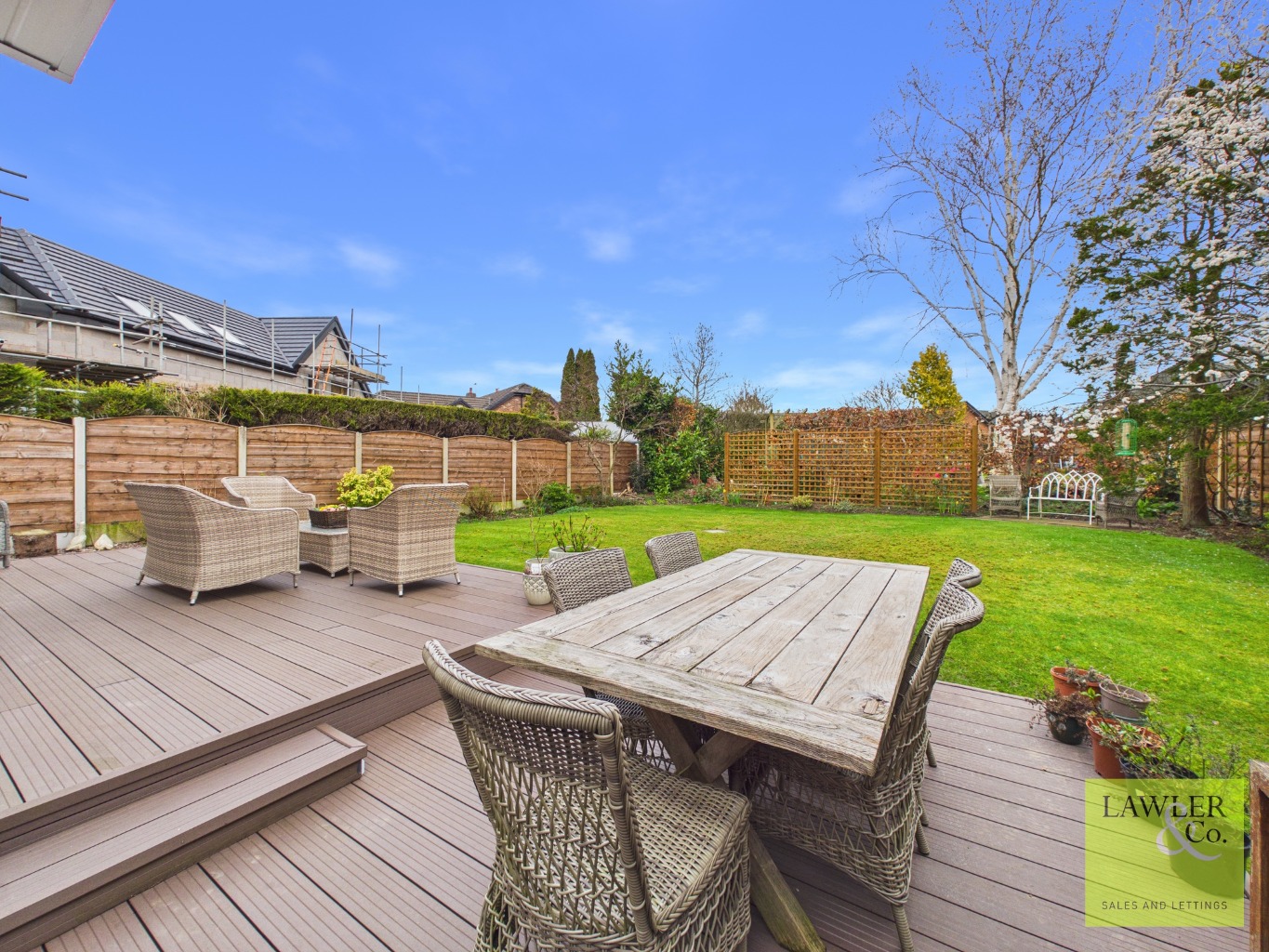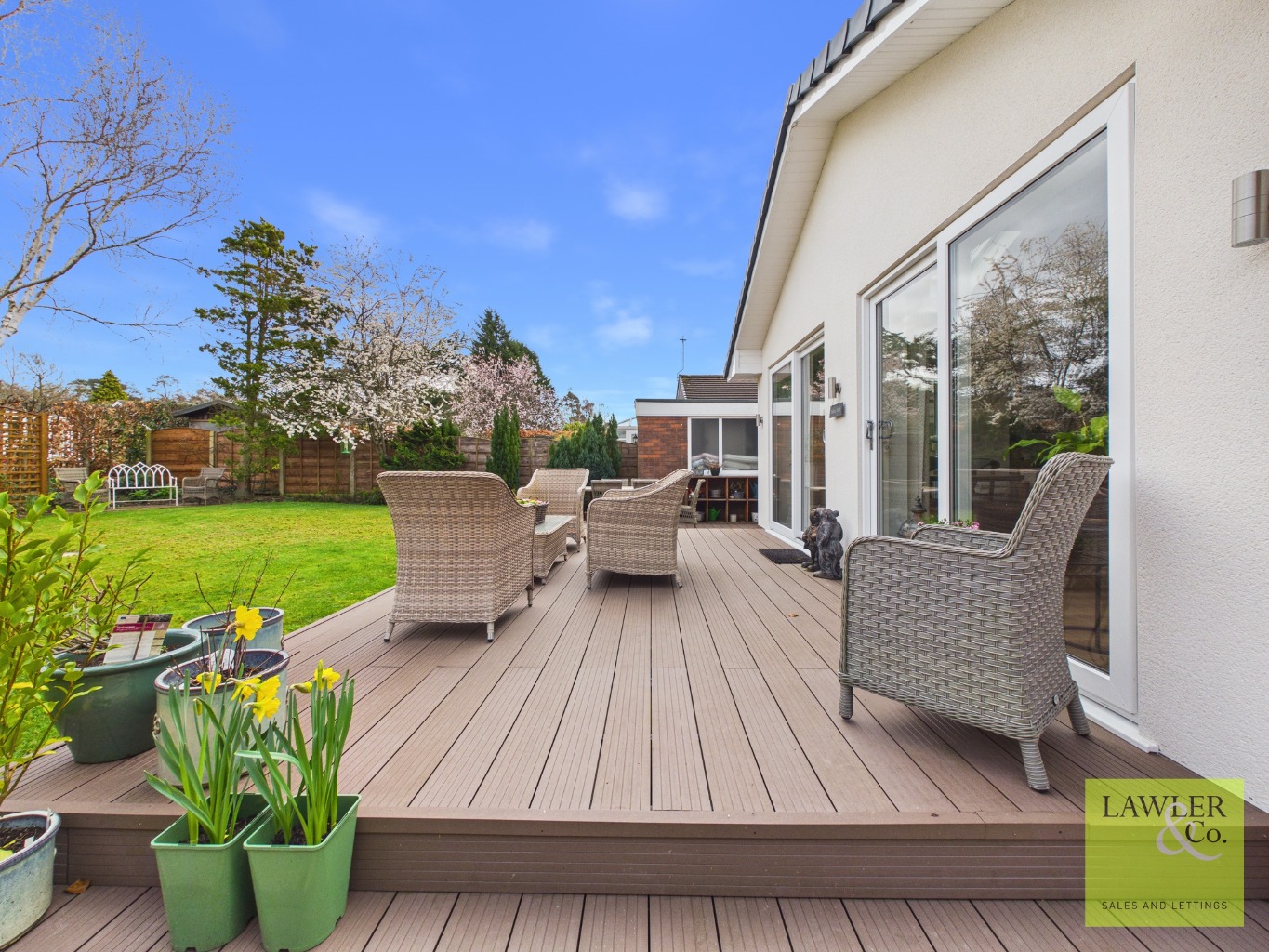 Externally, the front of the property offers ample off-road parking for multiple vehicles, along with access to the garage featuring an up-and-over door and electricity supply. A neatly lawned space with mature shrubs enhances the attractive frontage. Gated access leads through to the generously enclosed rear garden, where a spacious decking area provides the perfect setting for outdoor seating and entertaining. Steps lead down to a beautifully maintained lawn bordered by colourful planting, along with an additional seating area to the rear, and further access to the garage.