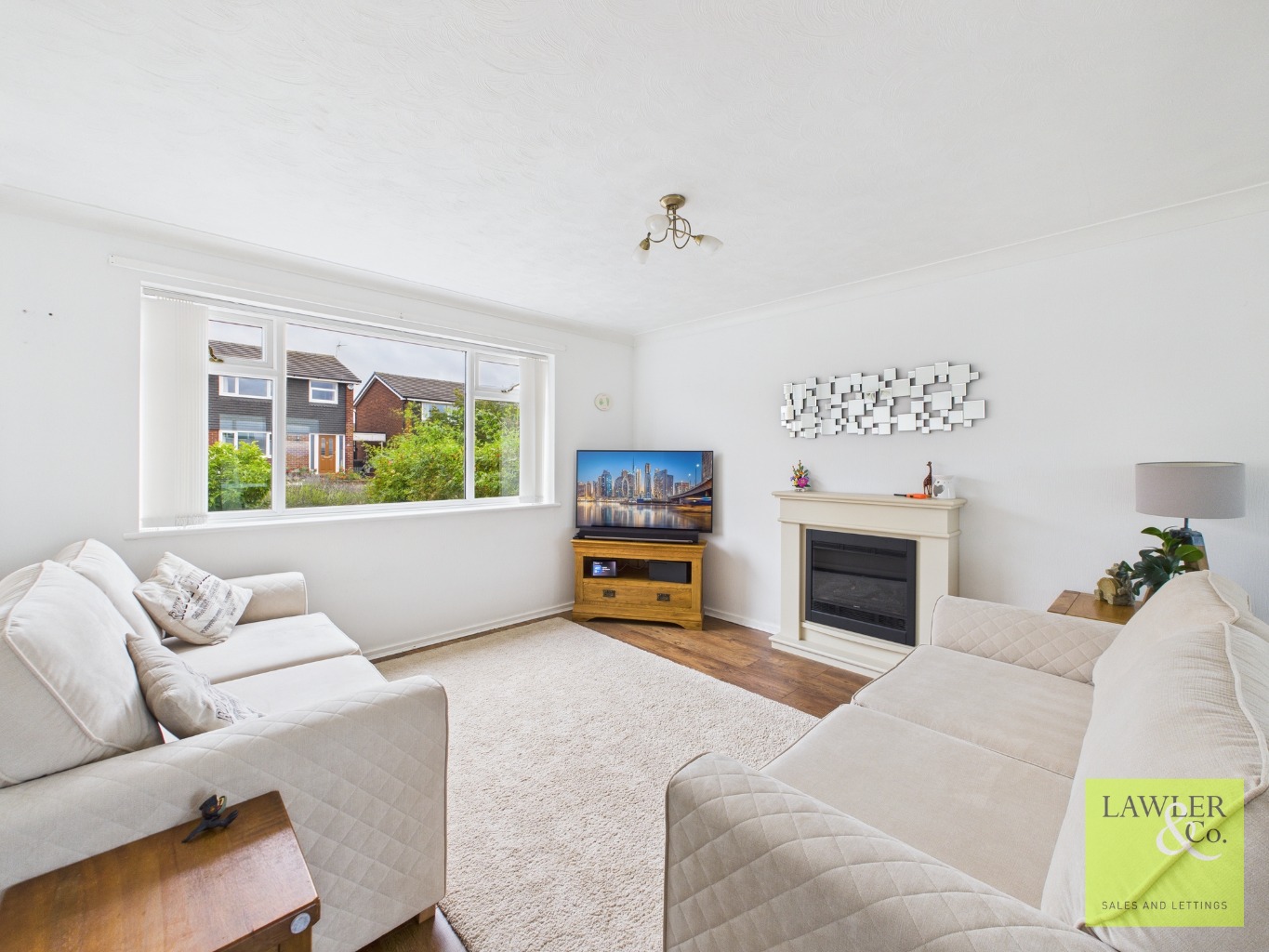 The ground floor comprises; welcoming entrance hallway with a downstairs WC for added convenience; generously sized open-plan lounge and dining room, featuring a stylish living flame electric fire and surround – ideal for both relaxing and entertaining; a bright conservatory opening out onto the rear garden, perfect for enjoying the afternoon sun and scenic westerly sunset views over the hills; a well-appointed breakfast kitchen fitted with an electric oven/gas hob and extractor hood. There’s also space for a washing machine, half-load dishwasher, and fridge-freezer, with room for a breakfast table.
