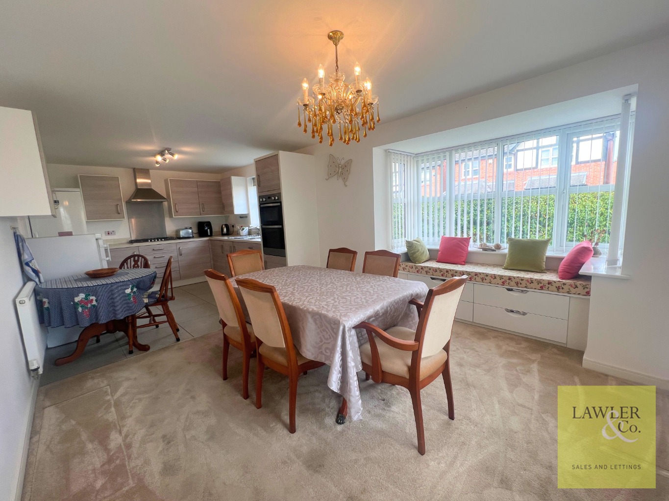 To the left, a generous full-length lounge is flooded with natural light and provides a wonderful space to relax. French doors seamlessly connect the lounge to the summer room, which in turn opens directly onto the rear garden, ideal for both everyday living and entertaining. To the right, the stunning open-plan kitchen and dining area forms the heart of the home. Designed with modern family life in mind, the dining space features a charming bay window with bespoke built-in seating and practical storage beneath, while the kitchen is fitted with a comprehensive range of stylish eye and base level units. A separate utility room adds further convenience for storing white goods and offers additional access to the garden.