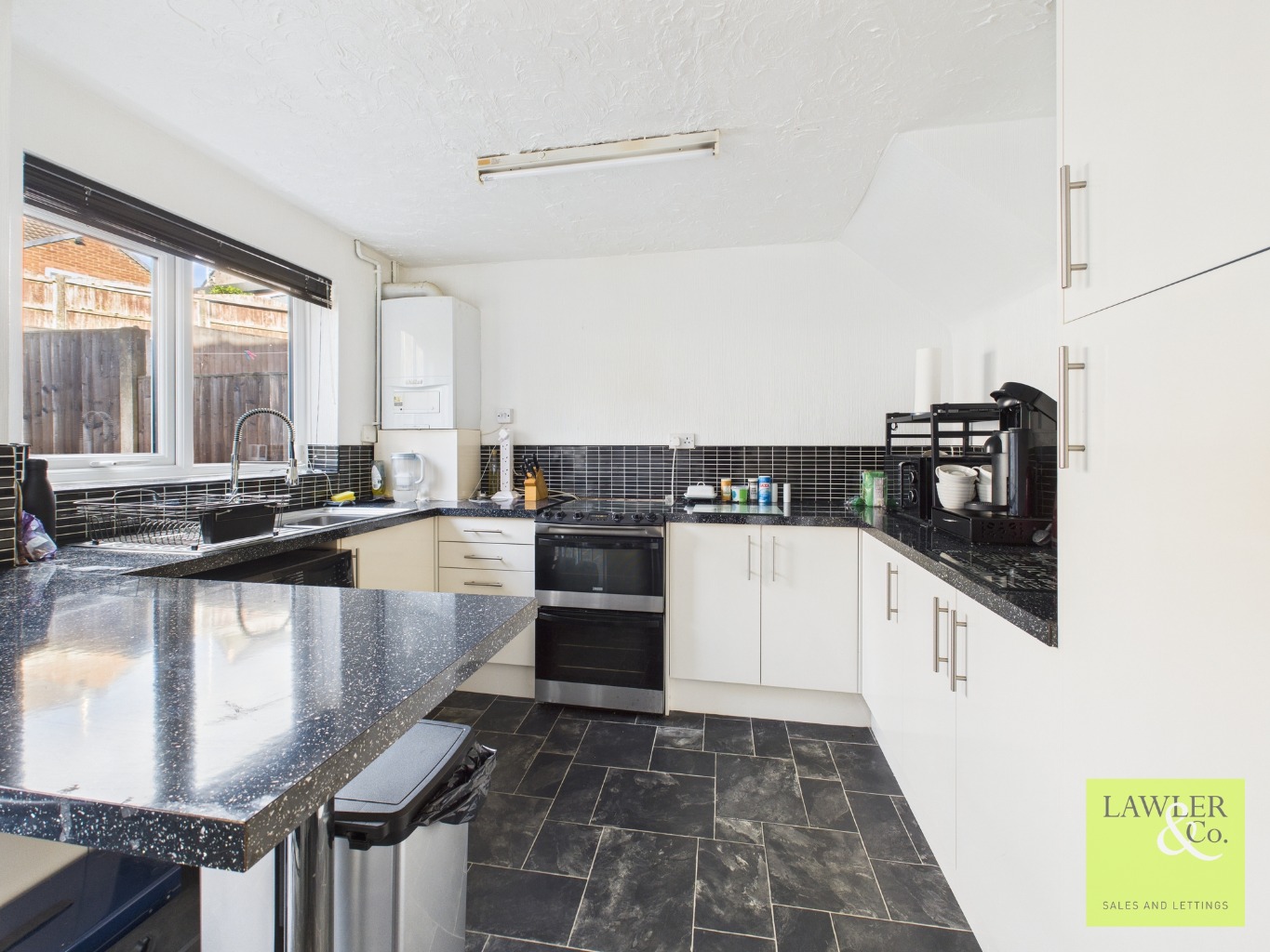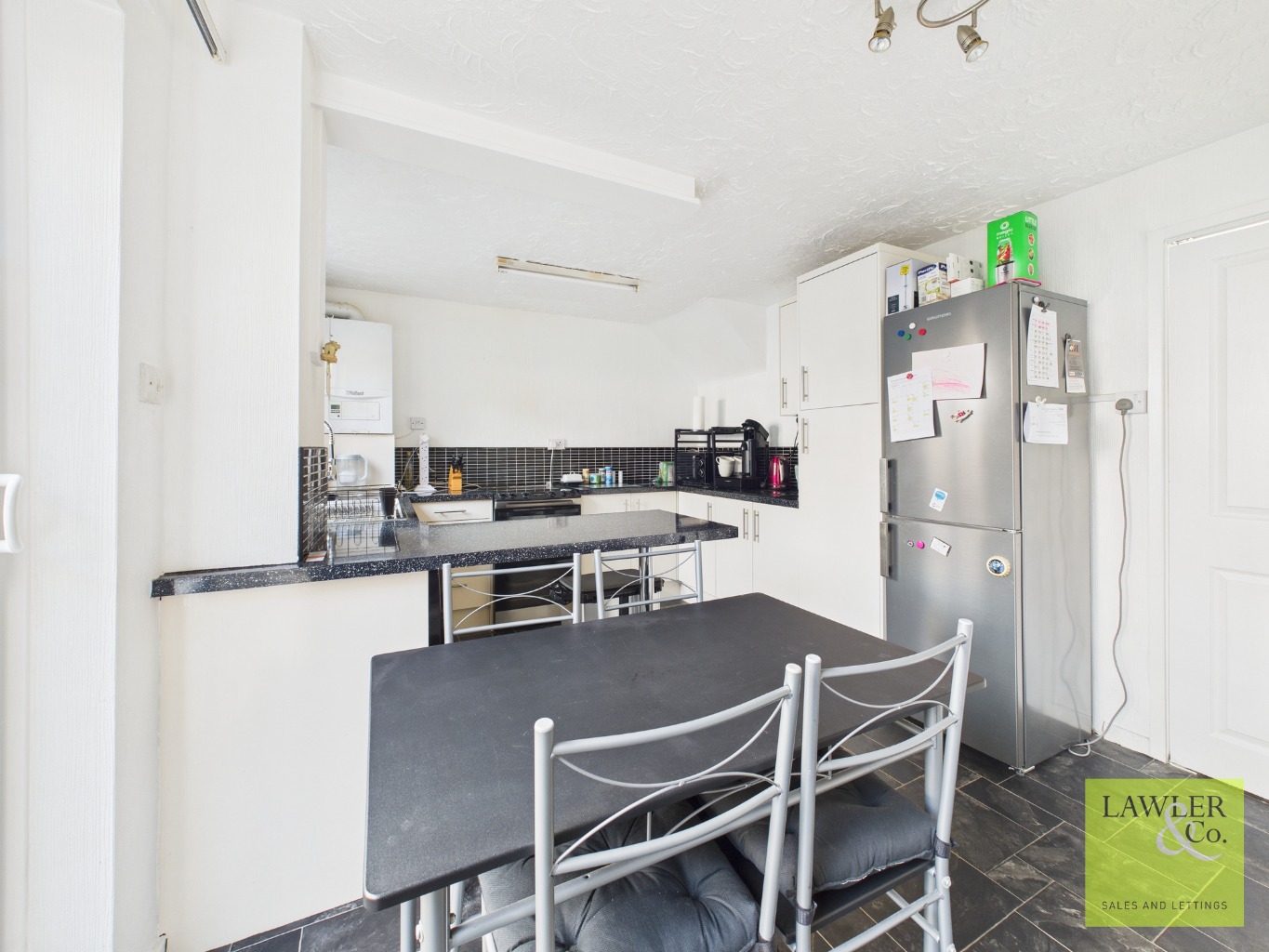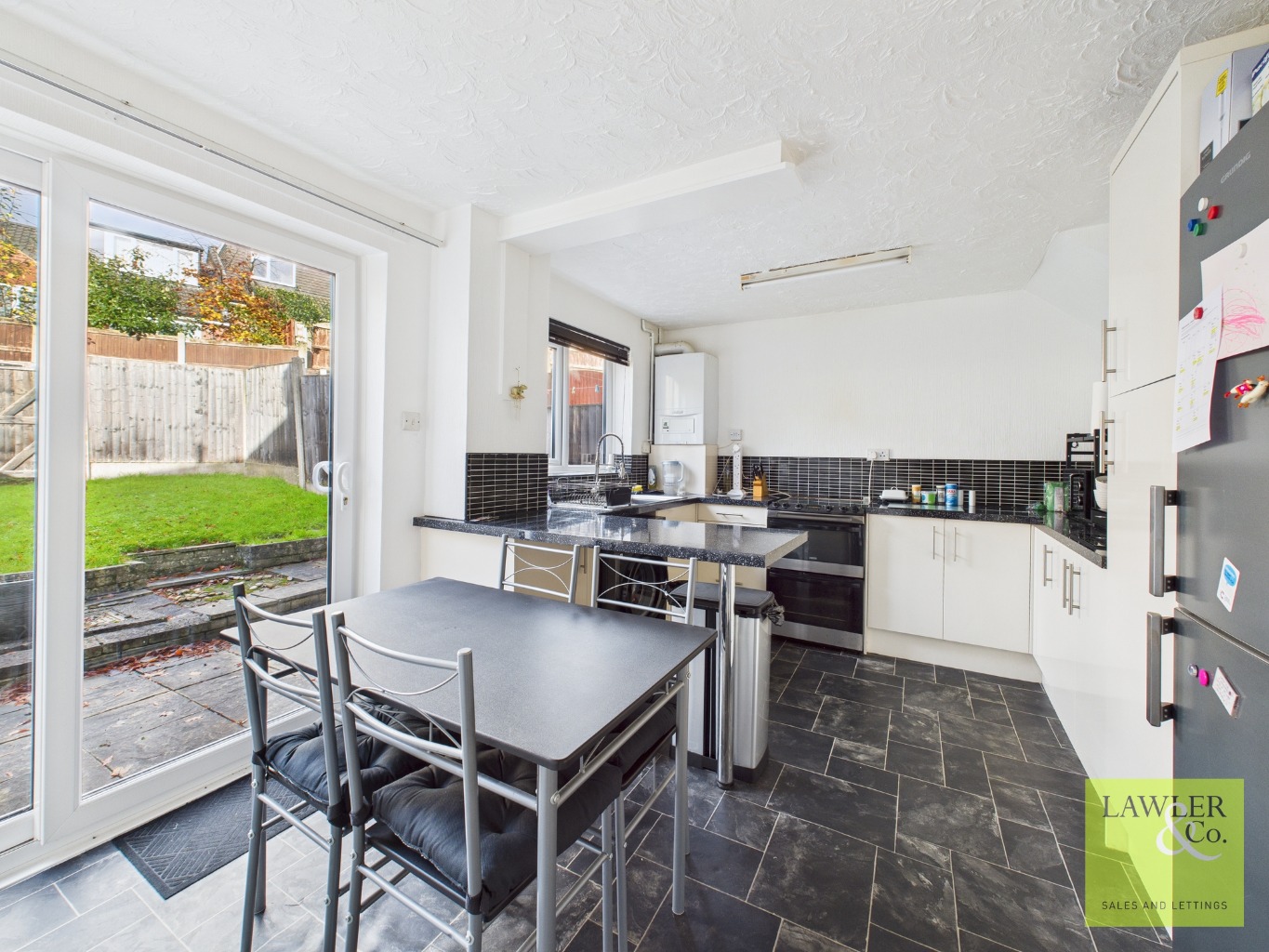 To the rear, you’ll find a spacious kitchen and dining area—a great space for everyday family meals or entertaining friends. There’s plenty of room for a dining table, making it the real heart of the home.