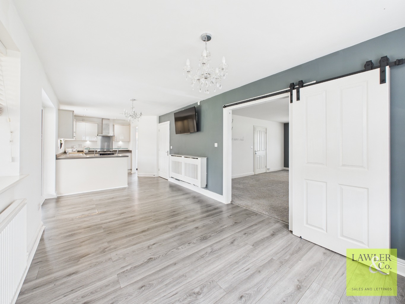 On entering the property into the welcoming hallway there is a useful downstairs WC with washbasin, an office/playroom and understairs storage cupboard. There is a spacious lounge with modern feature electric flame effect fire and media wall to house the TV and a bay window to the front. Sliding doors open into the spacious kitchen dining room with modern kitchen incorporating a full range of cream gloss units with grey wood effect work surfaces and integrated electric double oven, gas hob with extractor, washing machine and fridge and wine cooler. There is a sleek glass breakfast bar and ample space in the dining area for a family dining table with French doors opening to the garden. There is a useful utility room which houses the boiler and has plumbing for a washing machine, freezer and sink along with extra storage cupboards and access door to the side.