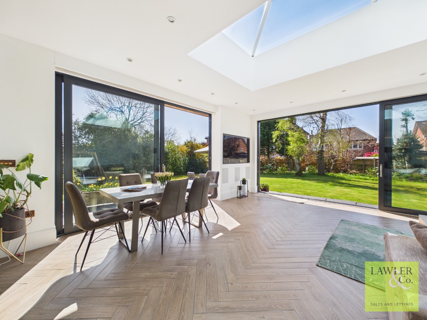 Undoubtedly the centrepiece of this home is the stunning open-plan kitchen/diner/sitting room to the rear, designed with both entertaining and everyday family life in mind. The genuine Hacker German handle less kitchen is finished to an outstanding specification and is perfectly complemented by Italian Marazzi porcelain herringbone flooring with underfloor heating, LED feature lighting and an extensive range of premium integrated appliances. These include a wine fridge, Miele ovens x2, coffee maker, microwave, full-size separate larder fridge and freezer units, induction hob and extractor. A stylish breakfast bar, generous storage solutions and a Dolby Atmos home cinema system with in-wall and ceiling speakers (Monitor Audio/Dali) with 9 speaker setup further enhance this impressive space. Oversized 2.6m Smart Systems sliding doors, upgraded to laminated glass, flood the room with natural light and provide seamless access onto the south-facing garden, creating a spectacular indoor-outdoor entertaining environment perfectly suited for both summer gatherings and winter comfort. The sliding doors also benefit from remote controlled electric blinds.