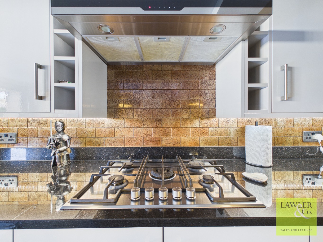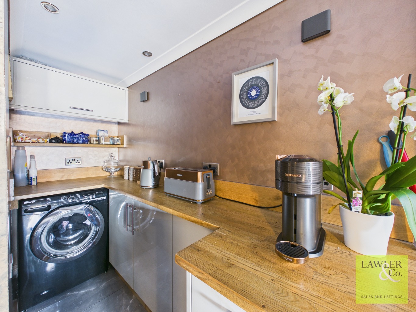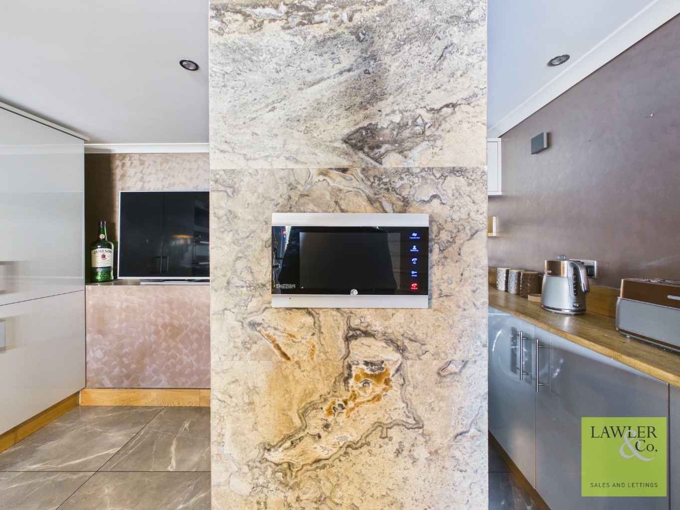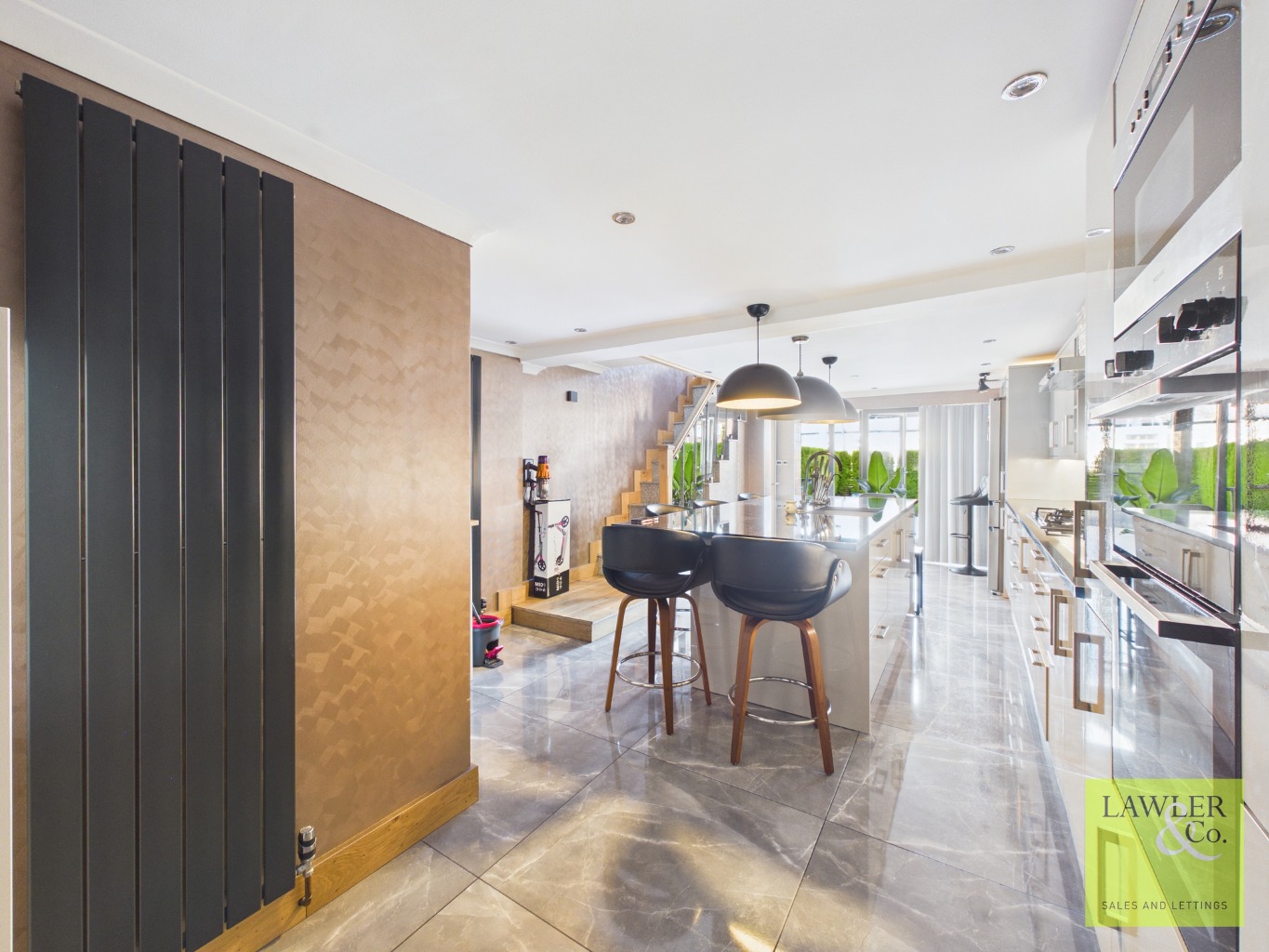 Returning to the main living accommodation, stairs lead down from the lounge to the true heart of the home: a stunning open-plan kitchen diner and living space. Designed for modern family life and entertaining, this expansive area features a comprehensive range of eye and base level units, oven with grill above, five-ring gas hob with extractor, and an island with breakfast seating. There is space for a fridge/freezer and dishwasher, along with a dedicated utility area with plumbing for a washing machine. Additional features include further intercom access and a convenient cloak storage area.