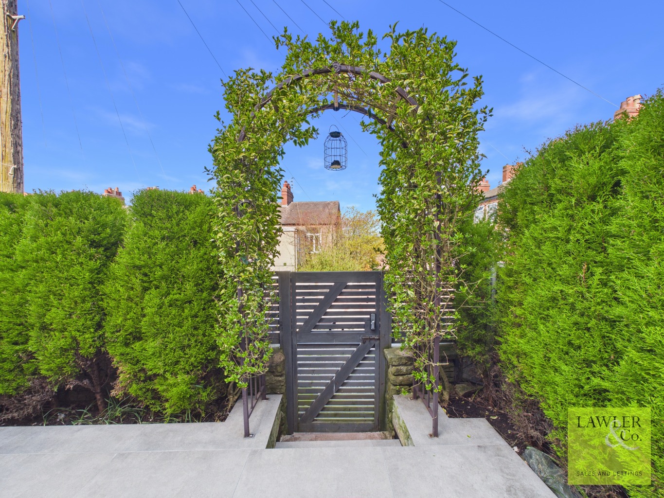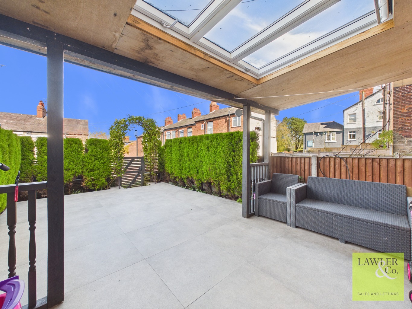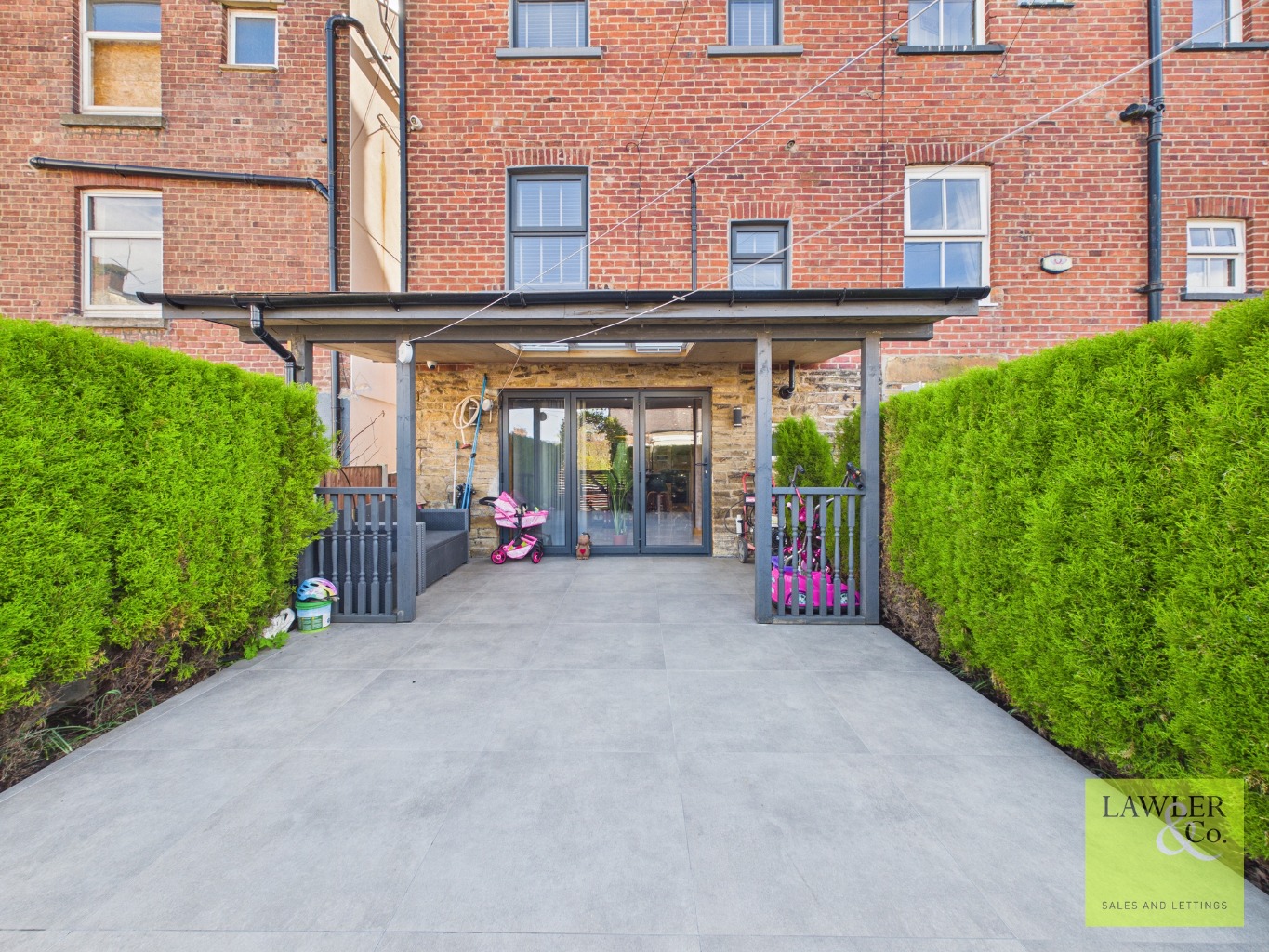 Bi-fold doors seamlessly connect the interior to the rear patio, creating an ideal indoor-outdoor lifestyle. The patio is bordered by hedging for privacy and offers sheltered seating, with access. To the front of the property, a further patio space with hedge surround provides an attractive and welcoming approach.