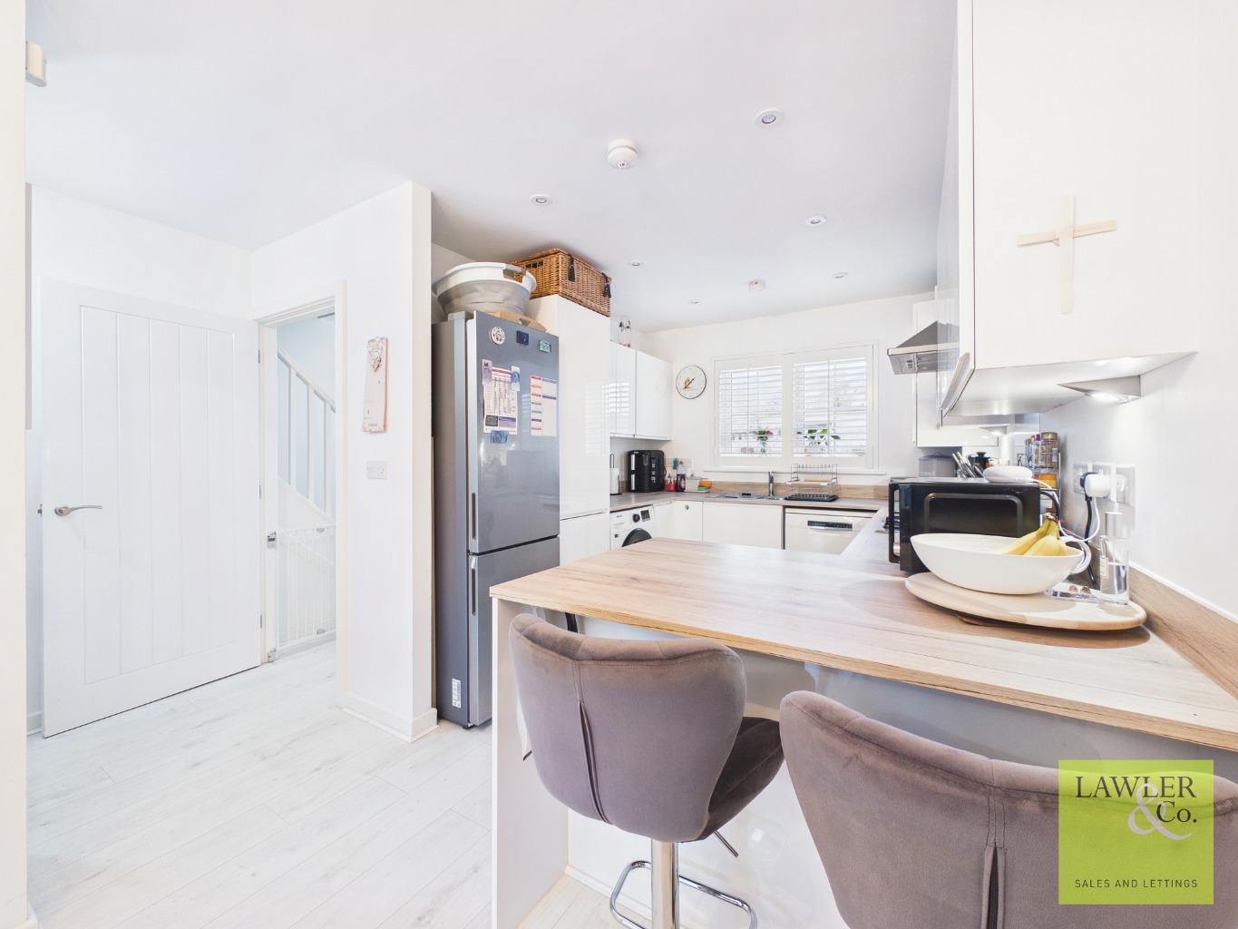 Boasting attractive limestone brick-effect elevations, the home immediately impresses with it’s stylish kerb appeal. Inside, a welcoming entrance hallway leads into a bright and contemporary open-plan kitchen diner and a spacious lounge. The kitchen is beautifully appointed with integrated appliances, a breakfast bar, and French doors at the back opening onto the rear garden, creating the perfect space for both everyday living and entertaining. The ground floor also benefits from a convenient WC with hand wash basin and a practical cloakroom area ideal for coats, shoes, and storage.