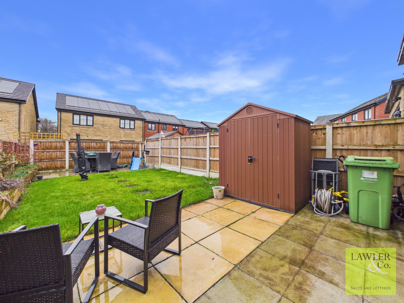 PRIVATE REAR GARDEN WITH PATIO, LAWN, AND HIGH FENCING