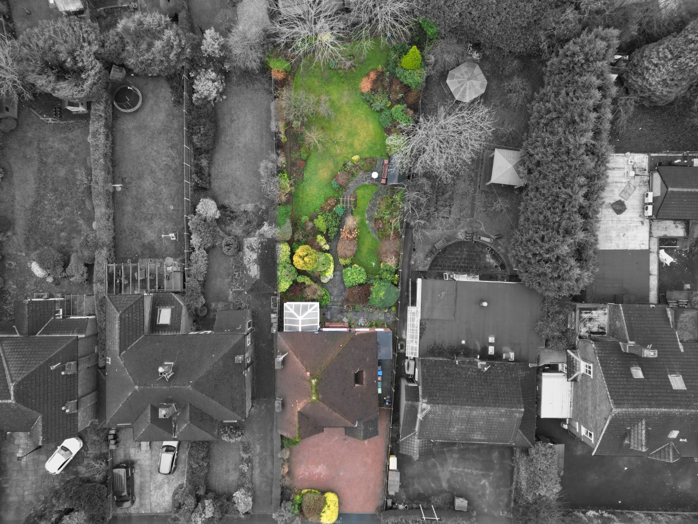 Externally, the property boasts an impressive rear garden featuring secret pathways, fruit trees, and mature shrubs, creating a peaceful outdoor space. To the front, a block-paved driveway provides off-road parking for several vehicles.