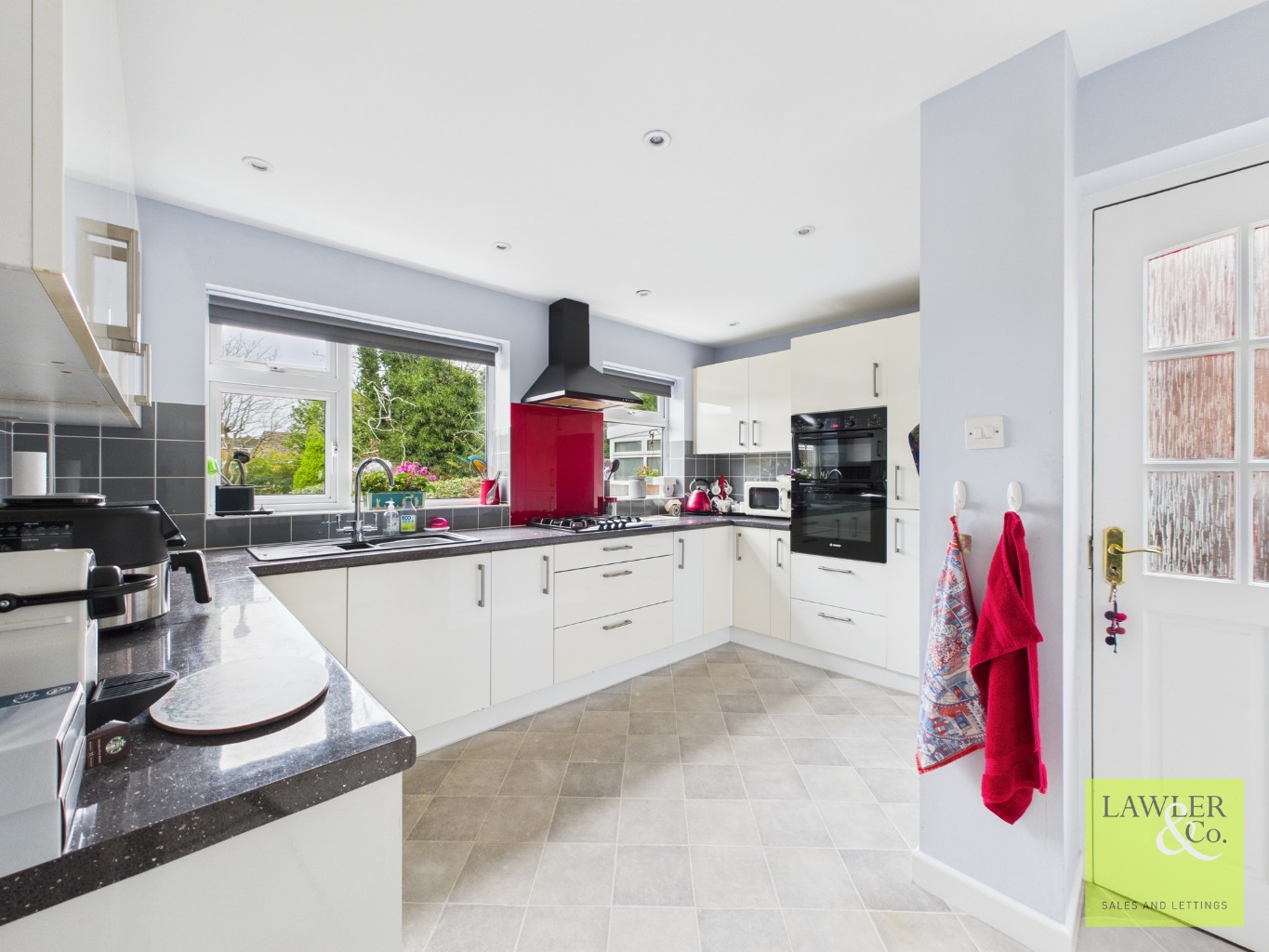 There is a separate dining room and a well-appointed kitchen fitted with an integral oven, hob, fridge freezer, and dishwasher. The kitchen provides access to the rear garden and the integral garage, which benefits from an electric garage door and space for additional white goods.