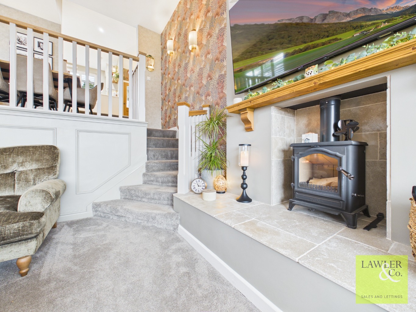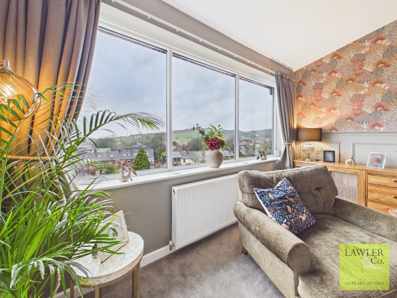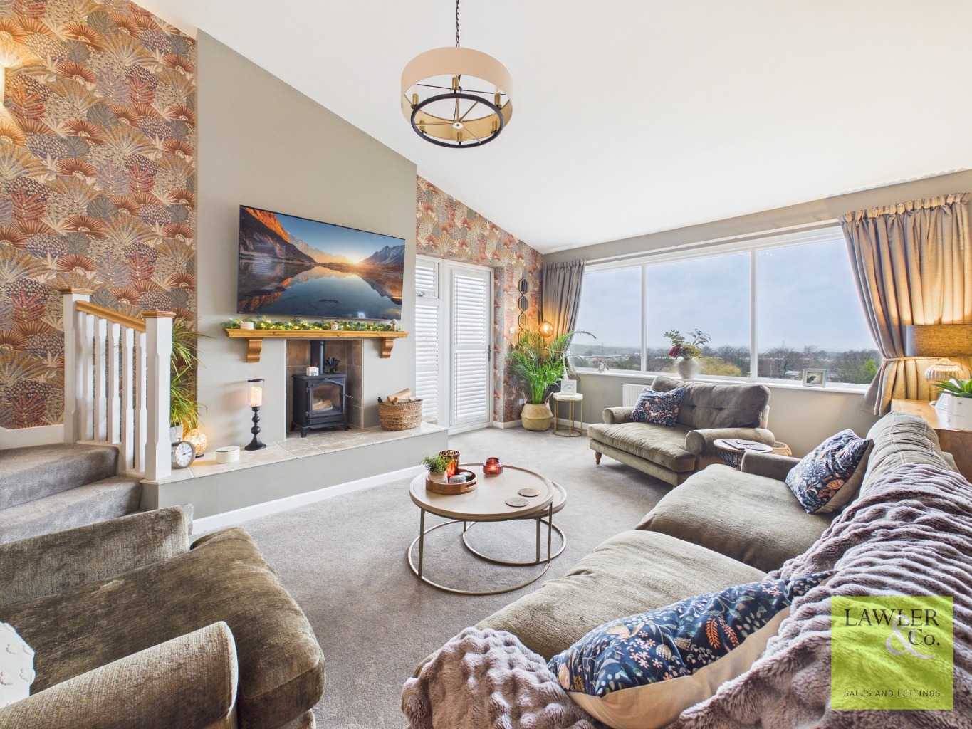 The lounge is a standout featuring a inset log-burning stove with a timber mantle and limestone hearth,and a large, light-filled window that perfectly frames breathtaking views. From here, watch sunsets over the Manchester skyline.
