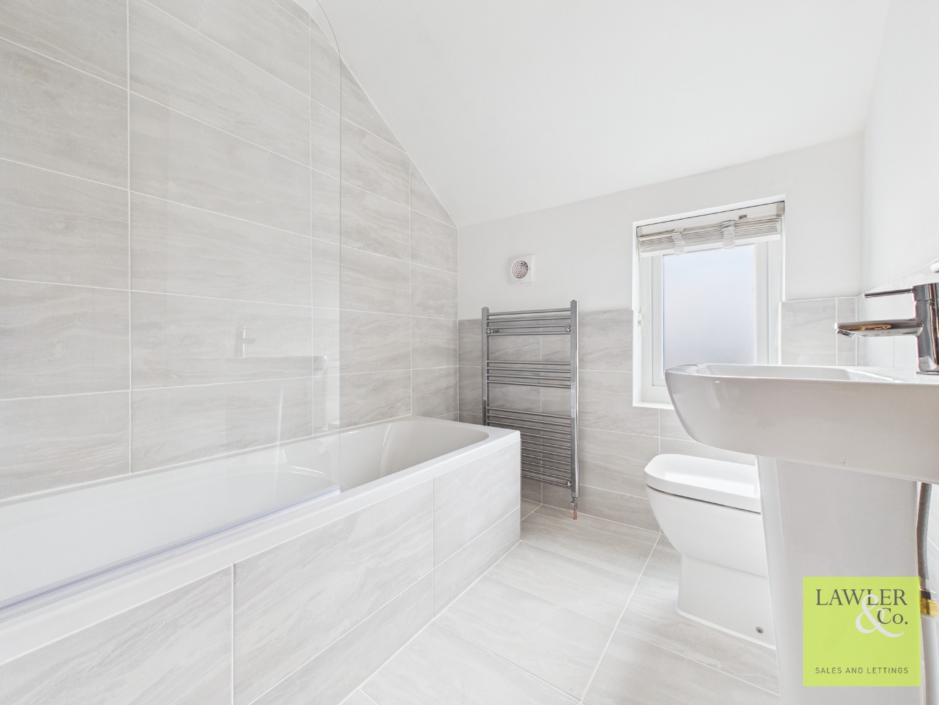 Staircase leading to the first-floor landing presents two well-proportioned double bedrooms. Both rooms are tastefully finished, offering a blank canvas for you to add your own personal touch. The main bedroom, positioned at the front of the property, further benefits from a walk-in wardrobe providing excellent closet space. The tastefully tiled three piece suite bathroom, includes bath with shower over, WC and hand wash basin.