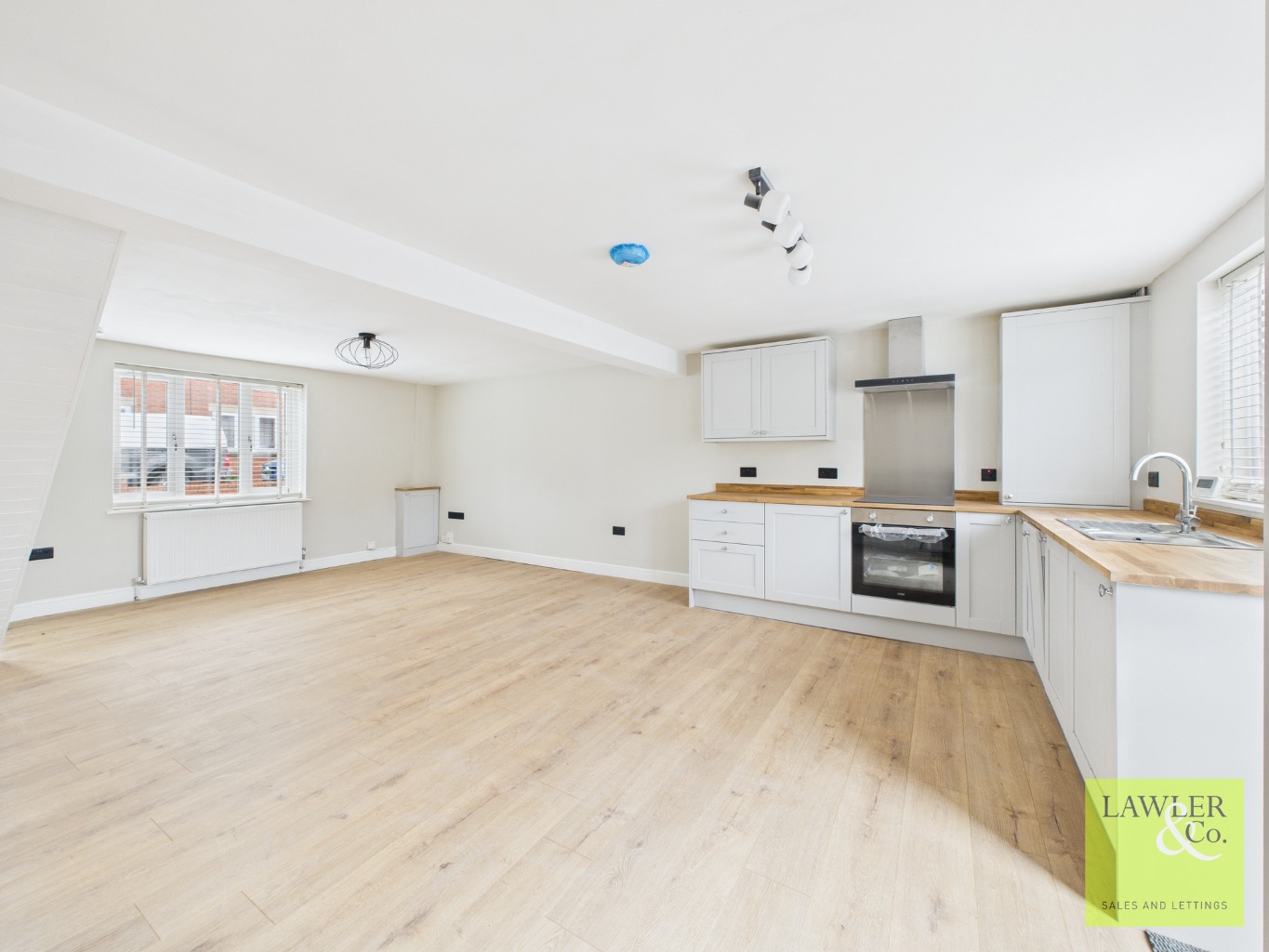 Upon entry, you are met with a thoughtfully designed open-plan living, kitchen, and dining area. Dual-aspect windows allow plenty of natural light to flow into the living space, while the modern kitchen features integral appliances including a fridge, freezer, oven with hob and extractor, dishwasher, and washer/dryer—perfect for everyday living. From here, a rear door provides access to the garden.