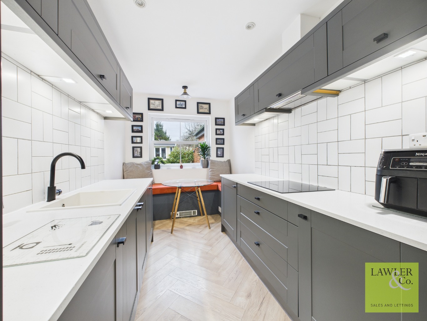 Upon entering the property you are greeted by a welcoming cosy lounge with a log burner with fitted shelving and plantation shutters. A door allows access to the staircase to the first floor. To the rear there is a second reception room with further log burner and French doors for access to the rear garden, flooding the room with natural light and storage cupboard below the stairs. To complete the ground floor accommodation is a beautifully finished contemporary kitchen with a range of eye and base level units with integral appliances including Bosh oven with extractor above, Bosh microwave, a dishwasher and integrated fridge freezer, also including a bespoke seating area. Herringbone style flooring runs throughout the downstairs accommodation.