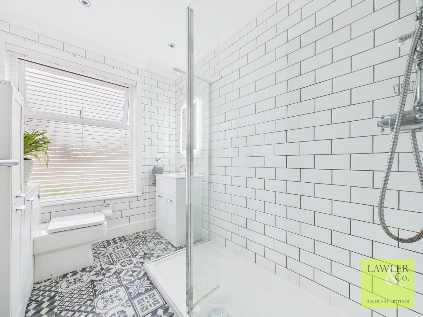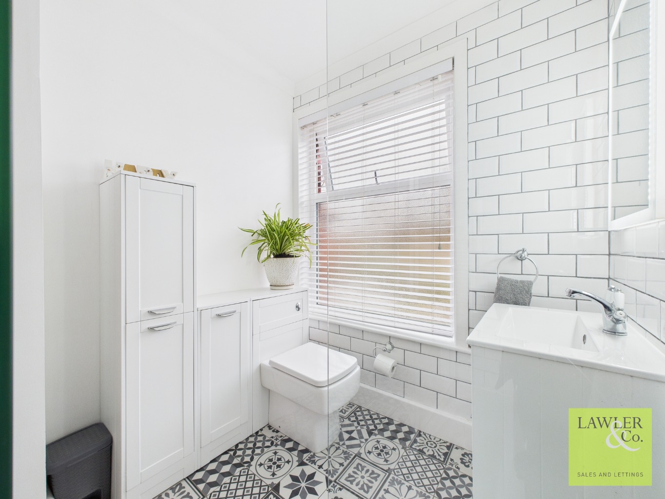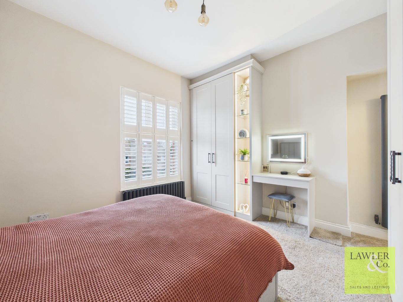 To the first floor there are two double bedrooms. The master positioned to the front of the property includes fitted wardrobes with lit storage shelves and a dressing table with plantation shutters. The second double bedroom includes a walk in storage area and views to the rear. Completing the accommodation is a stylish recently fitted tiled bathroom suite with walk in shower, WC and sink with storage units.