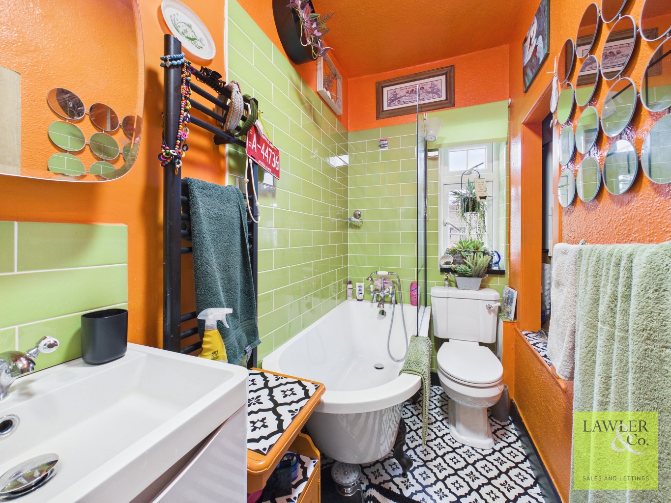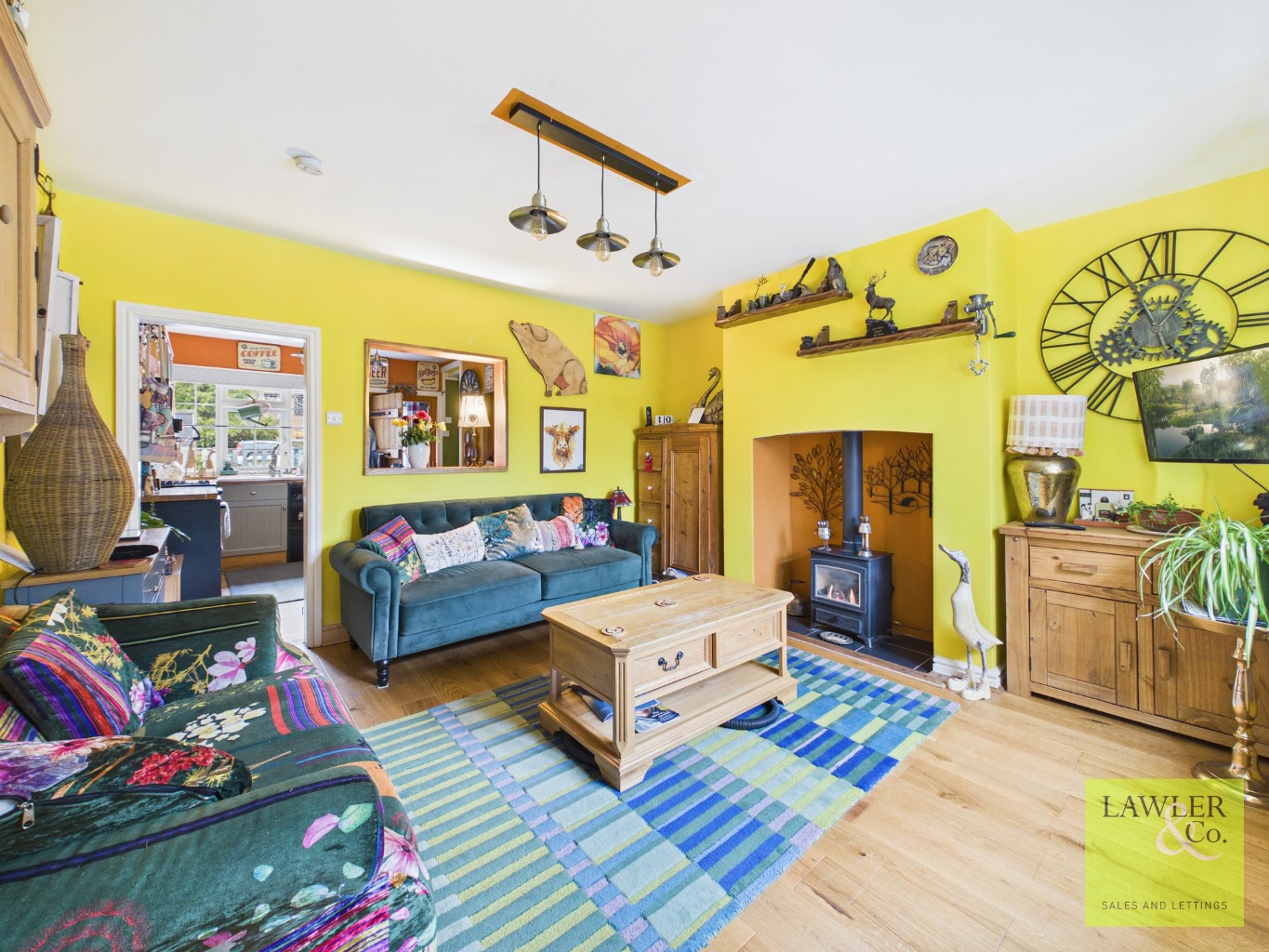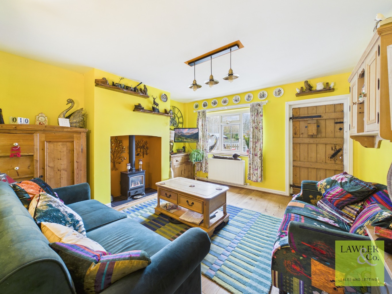 The accommodation is both characterful and well-proportioned, comprising an entrance porch, welcoming living room, and a spacious dining kitchen fitted with a range of units and ample space for a dining table. A useful rear porch provides additional utility space. To the first floor are two bedrooms and a family bathroom. The property benefits from gas central heating and double glazing throughout.