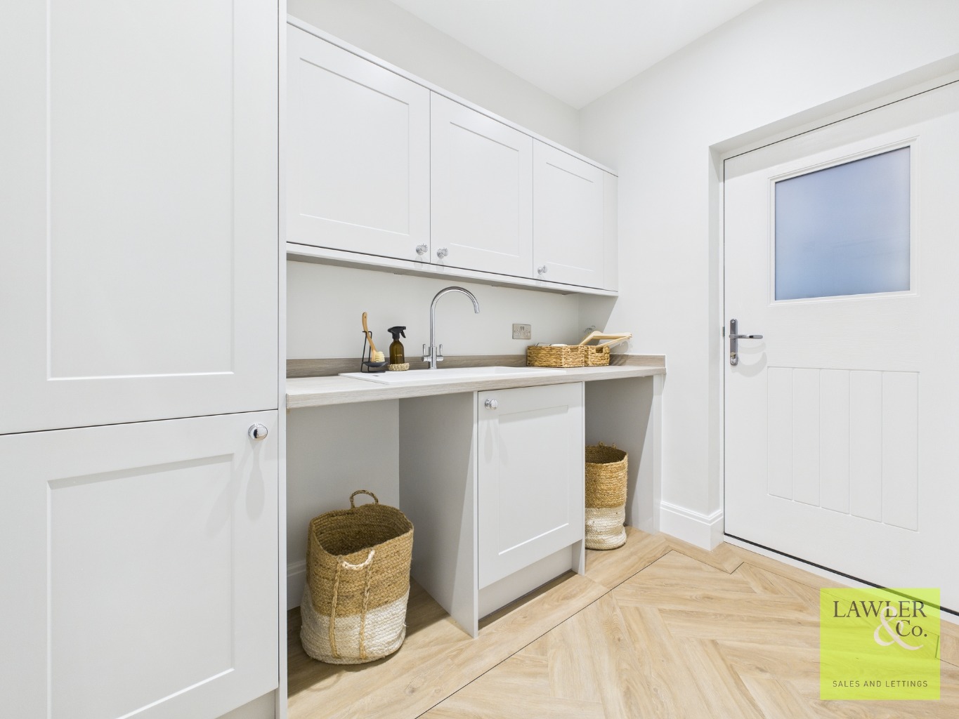 A well-equipped Utility room with ample storage and laundry facilities with side access.