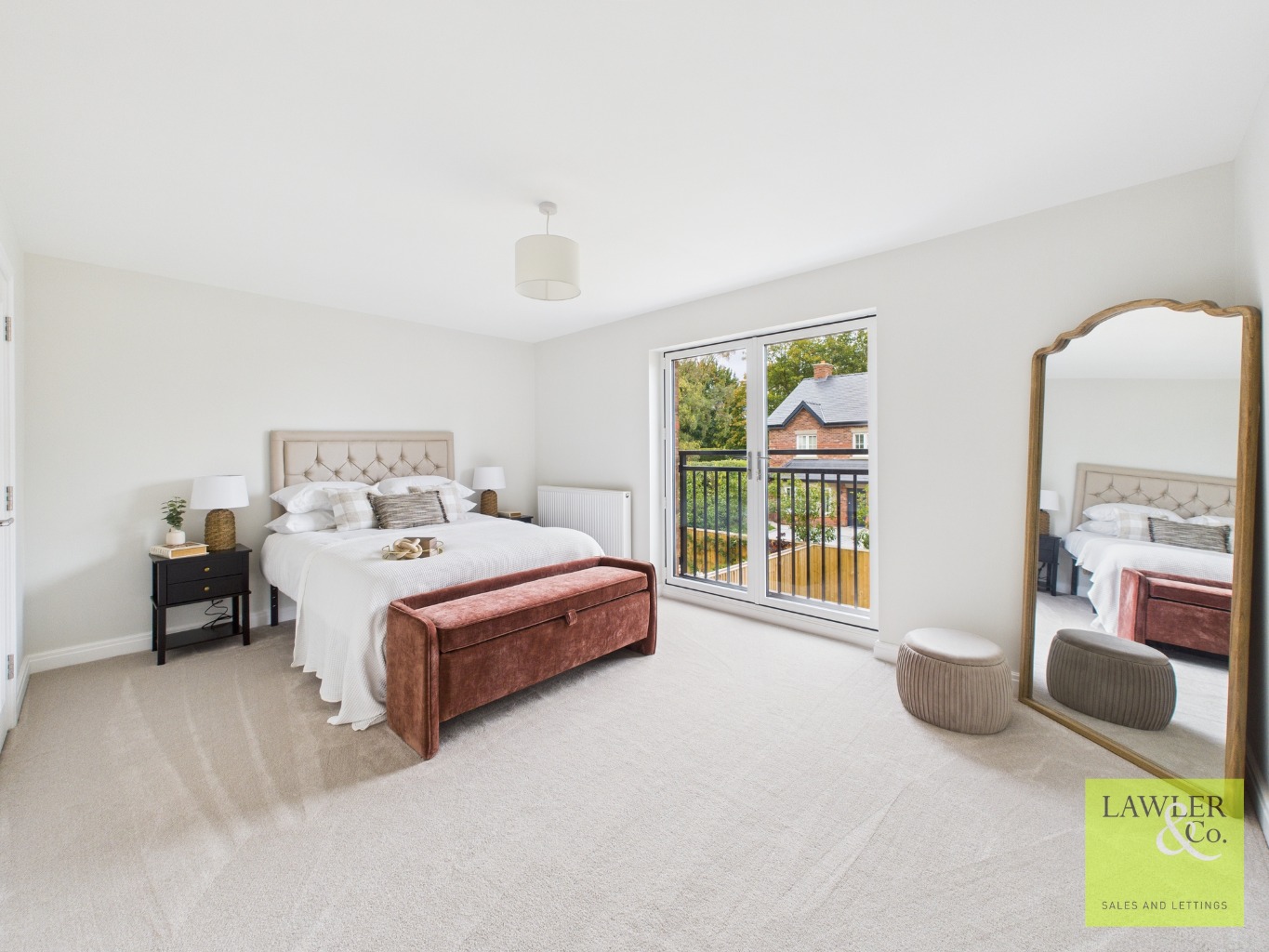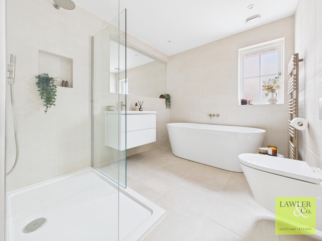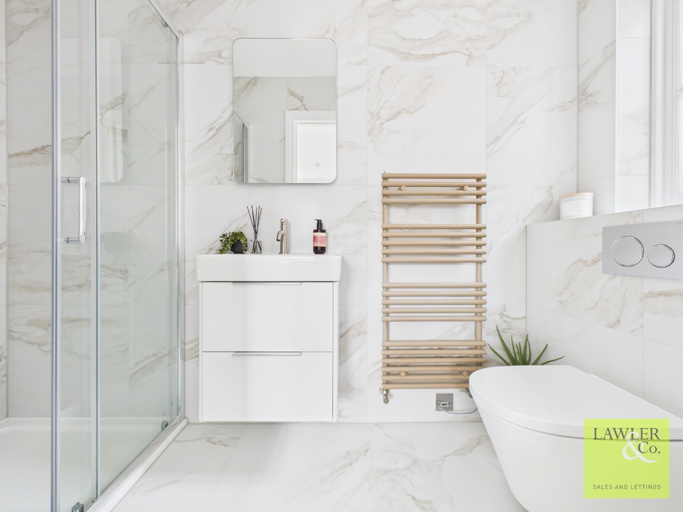 Main bedroom offers a relaxing retreat featuring a Juliet balcony overlooking the rear garden. A stunning en-suite shower room, fully tiled in a marble effect finish, complete with a walk-in shower, low-level WC, hand wash basin and walk-in shower.