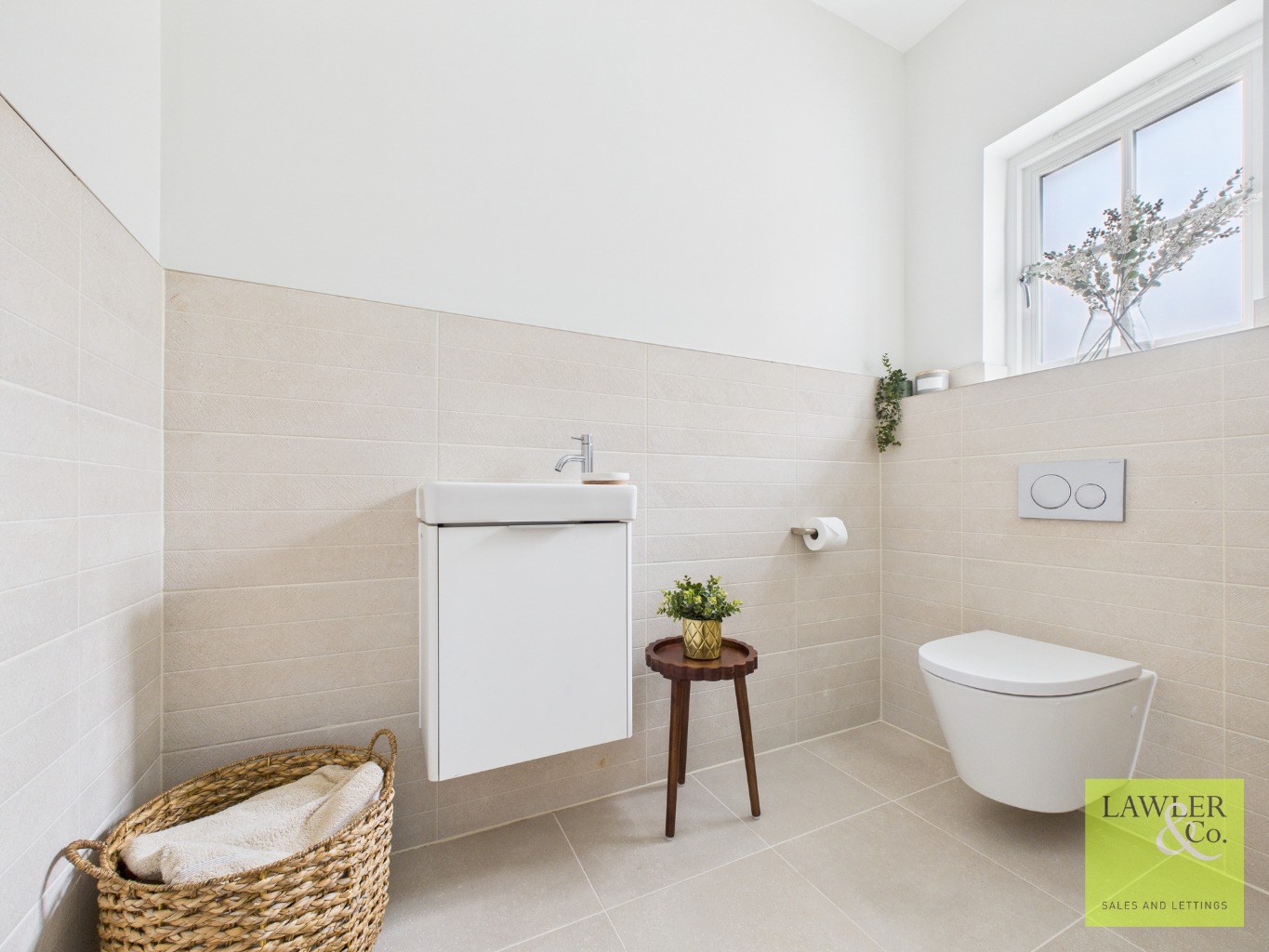 Stylish downstairs WC with a partially tiled finish offering a low-level WC and hand wash basin.
