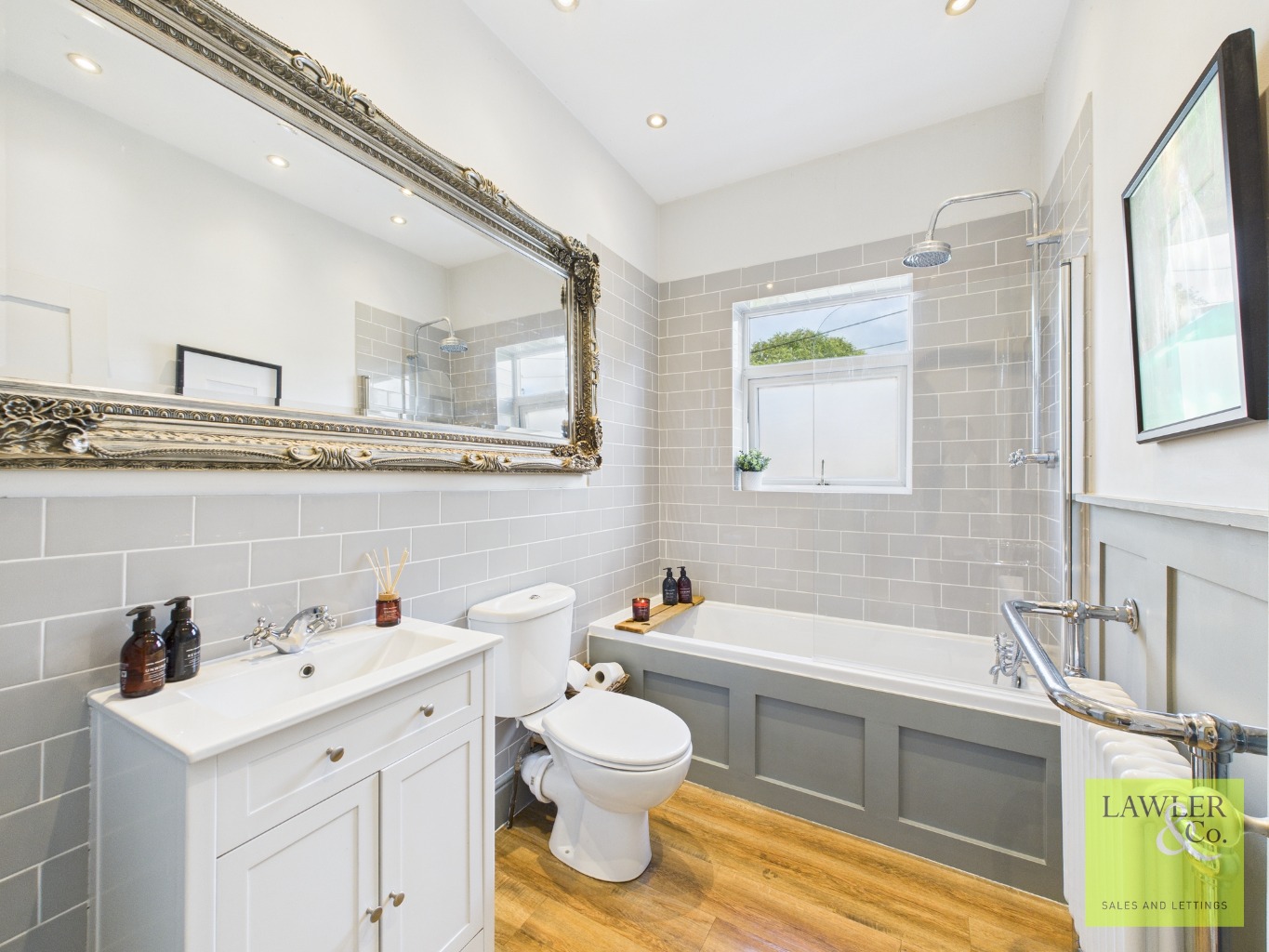 The stunning family bathroom comprises of a bath with shower over, a vanity sink with storage, WC and heated towel radiator and neat complementary tiling.