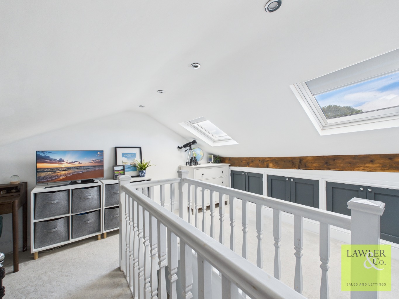 From the landing, stairs go up to the second floor where the loft has been converted ( with building regs) into a third bedroom. This lovely bright space has two Velux windows and plenty of handy eaves storage cupboards.