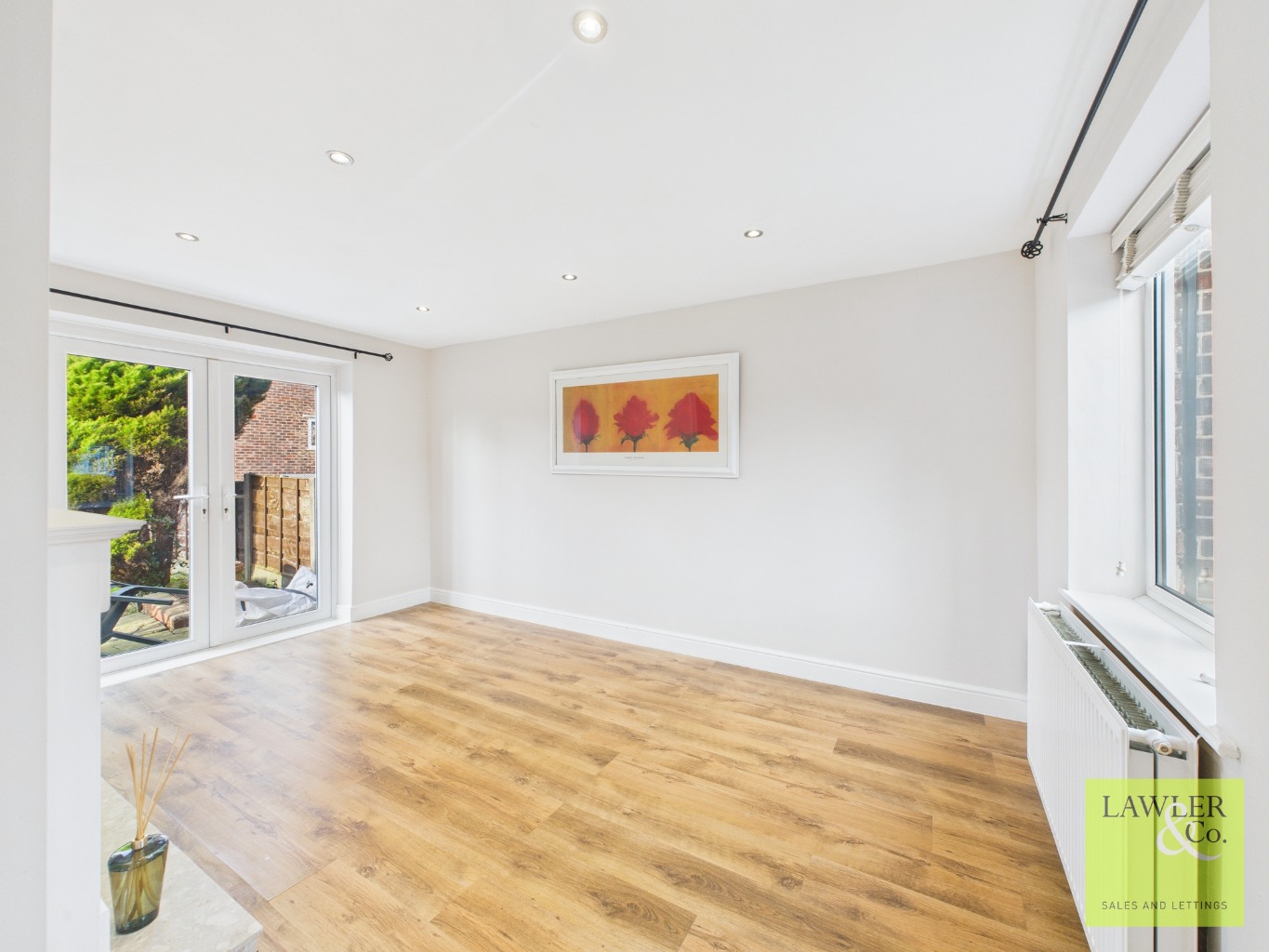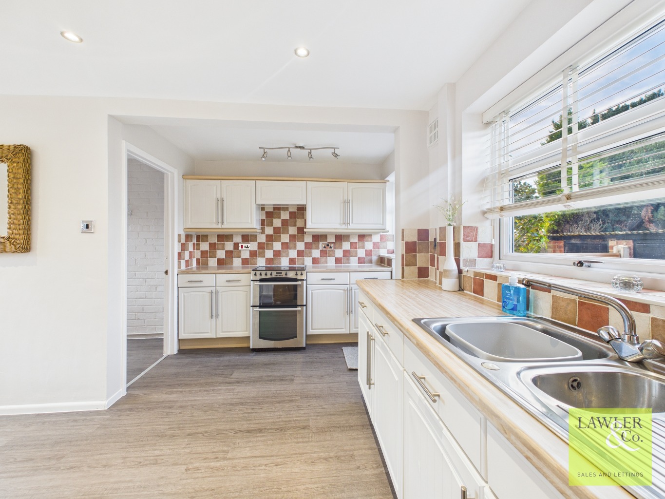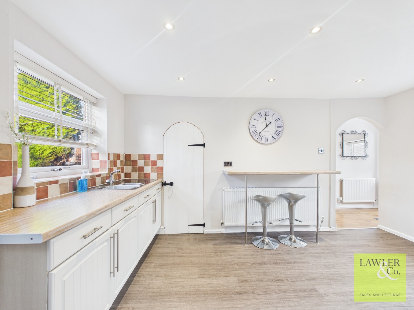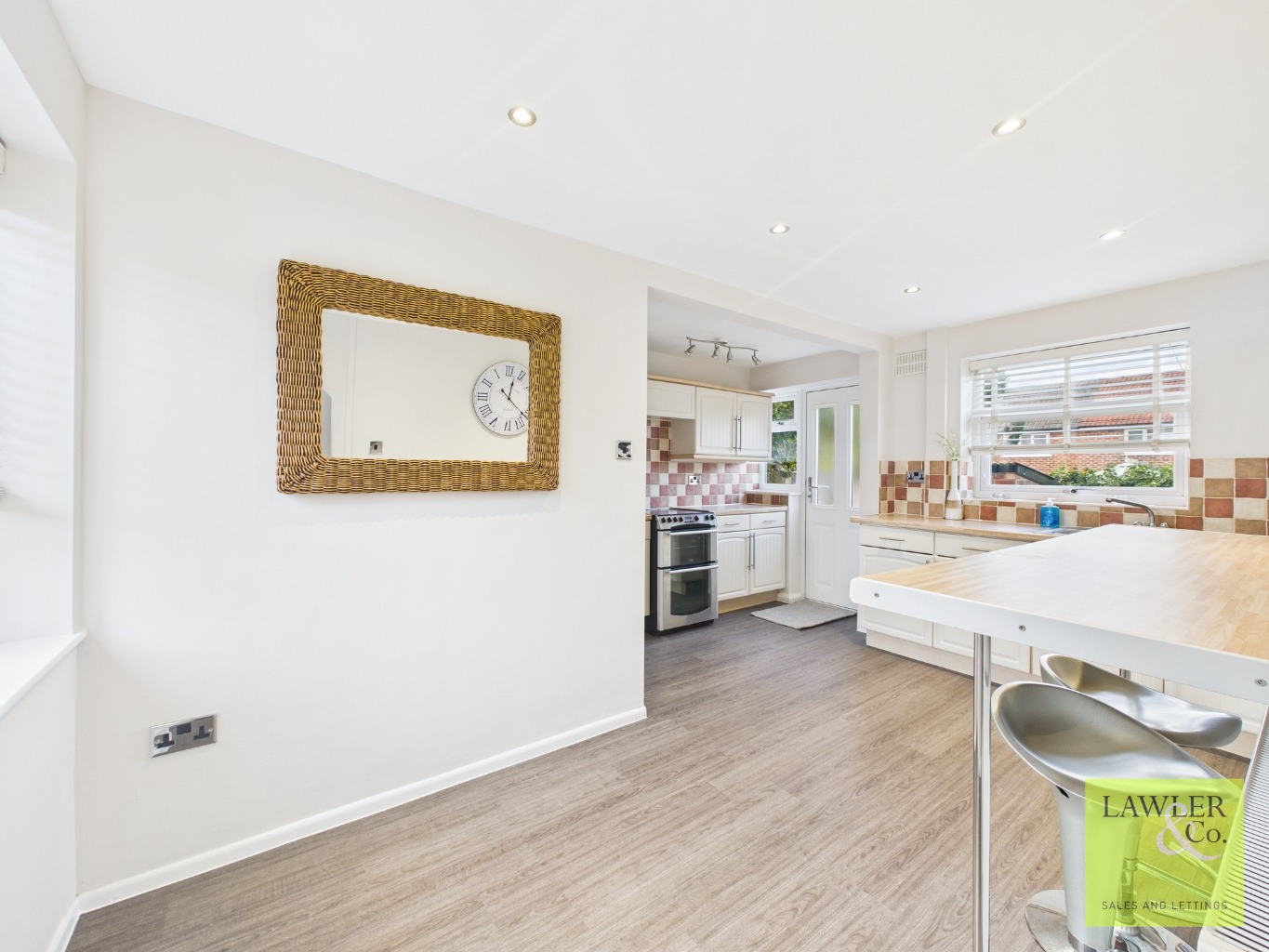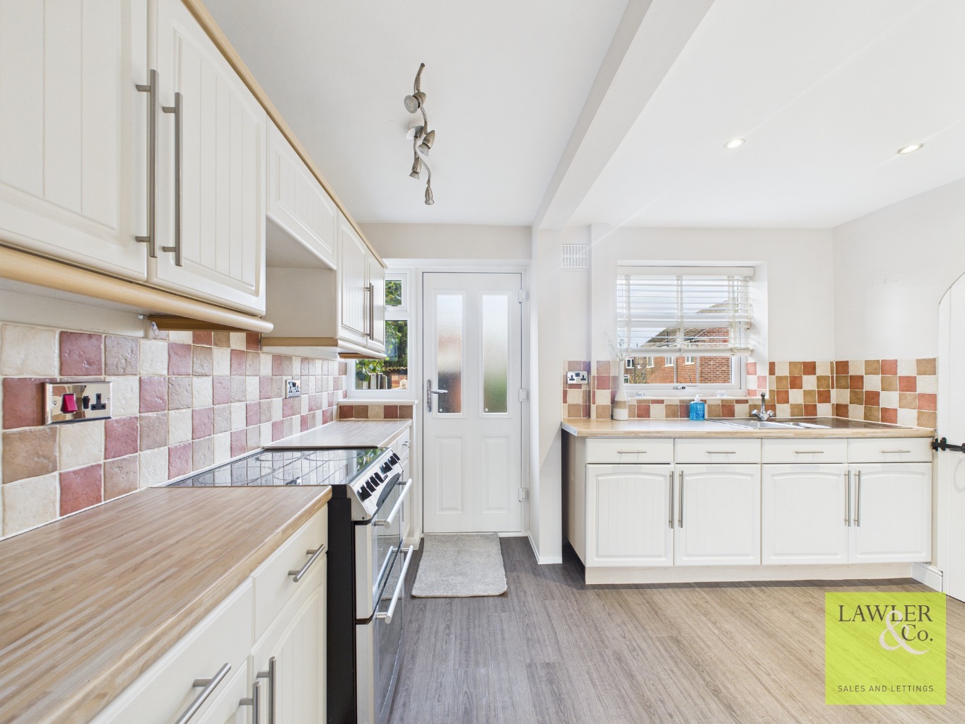 On entering the property, you’re welcomed into a small hallway which opens into a generous living room featuring decorative coving, alcoves on either side of the fireplace, providing a cosy yet spacious setting. French doors open out to the rear garden, allowing for plenty of natural light and easy outdoor access. The part-tiled kitchen is fitted with matching cream wall and base units with wood effect work surfaces over. A convenient utility porch offers additional storage and houses the central heating boiler.There is a handy breakfast bar and space for a small dining table and an access door to the garden.