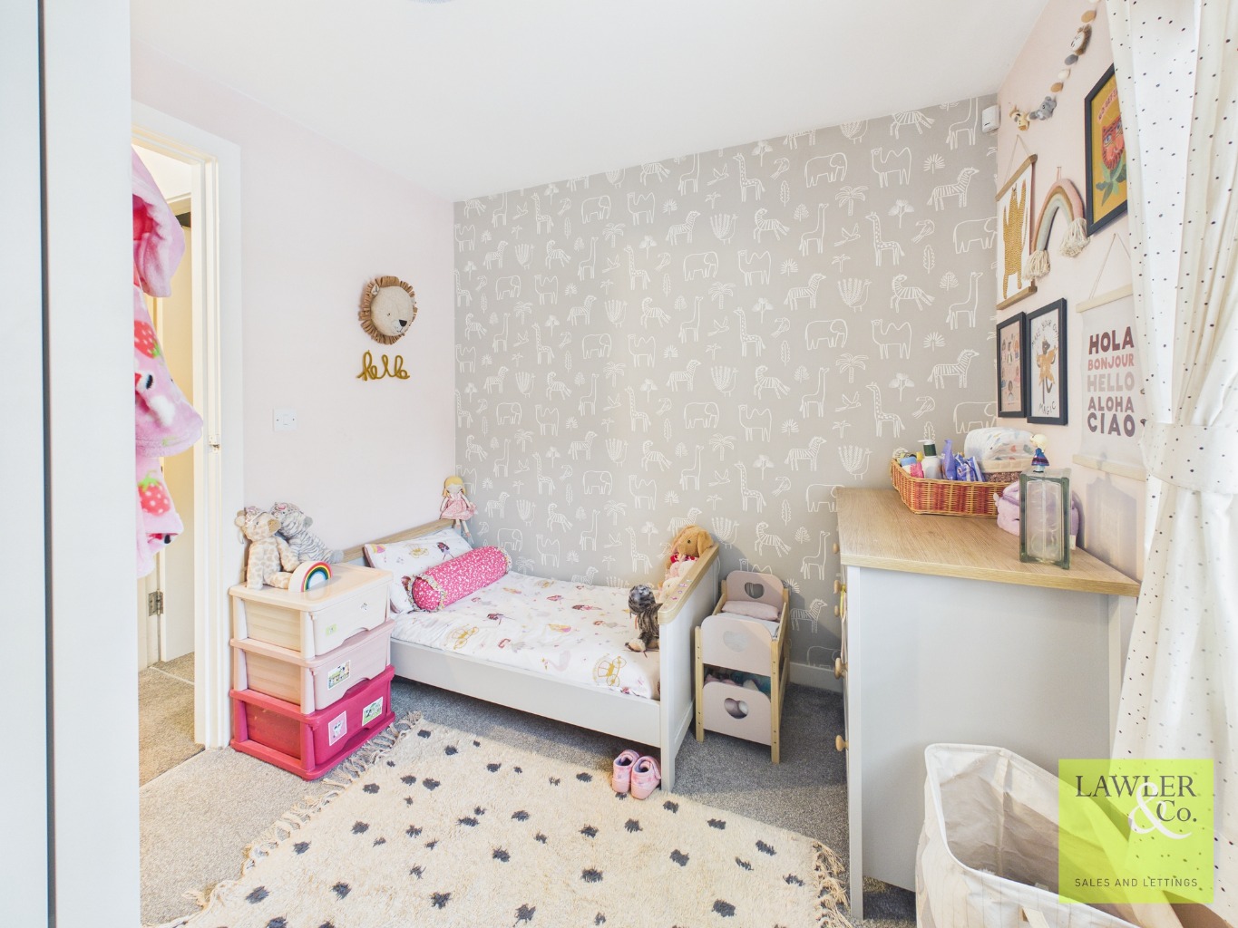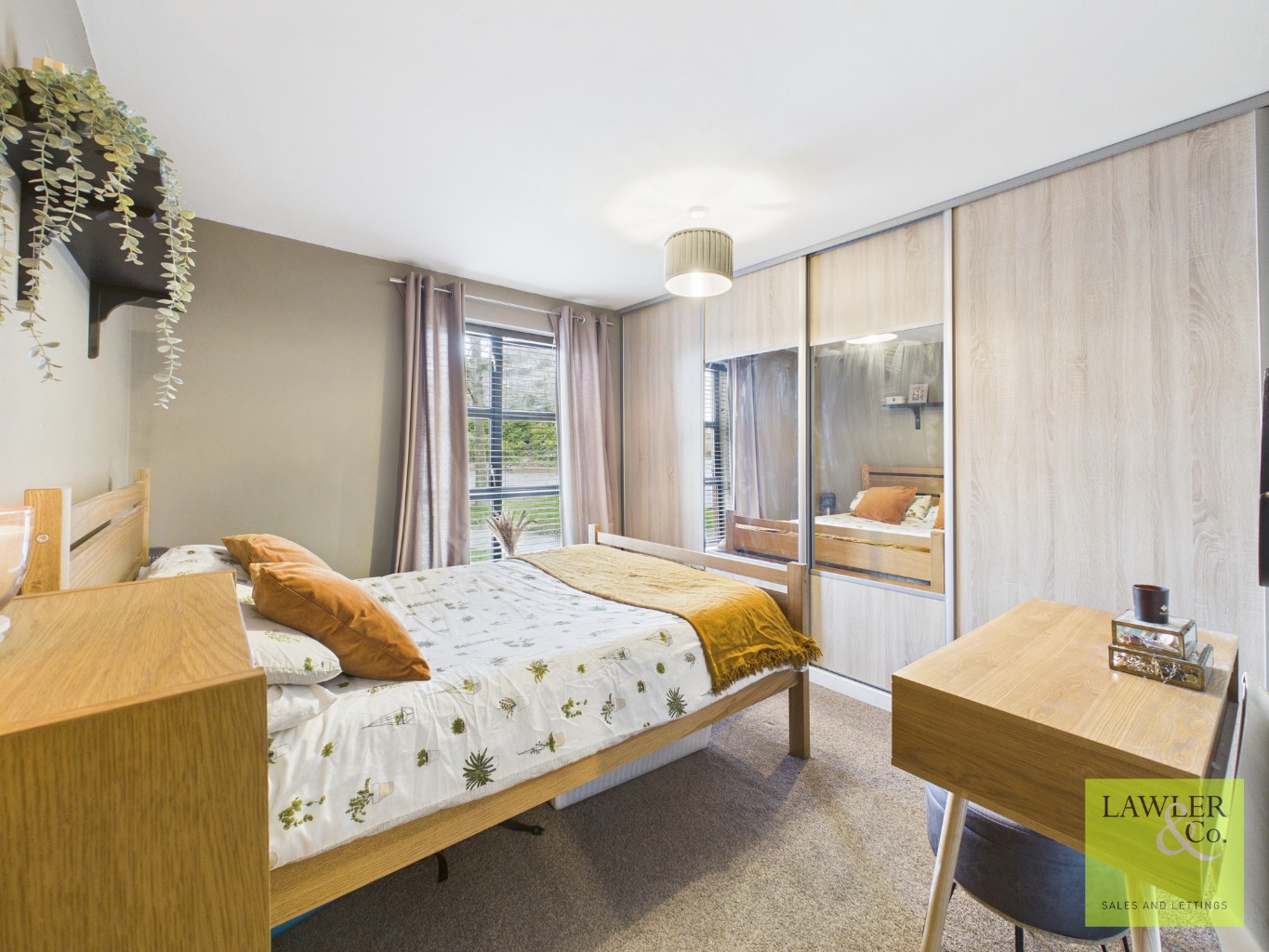 You enter into a large hallway with ample storage for shoes and coats, keeping the space tidy and practical. The hallway leads into a generous open-plan lounge, dining, and kitchen area, providing plenty of space for both relaxing and entertaining. The lounge benefits from large windows that fill the room with natural light, while exposed brickwork adds a stylish industrial touch. There’s also room for a dining table, making it perfect for everyday meals or hosting guests.
