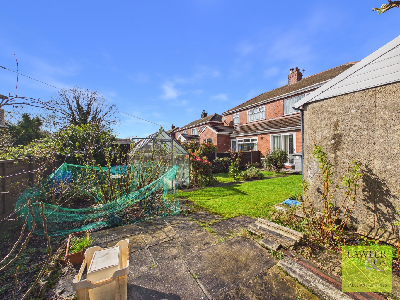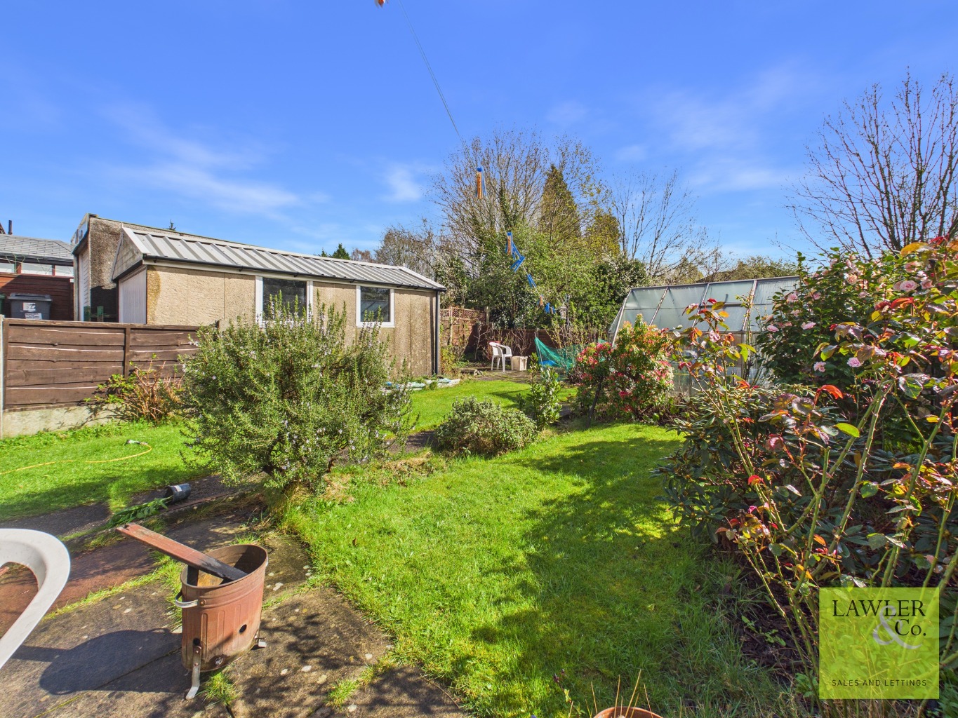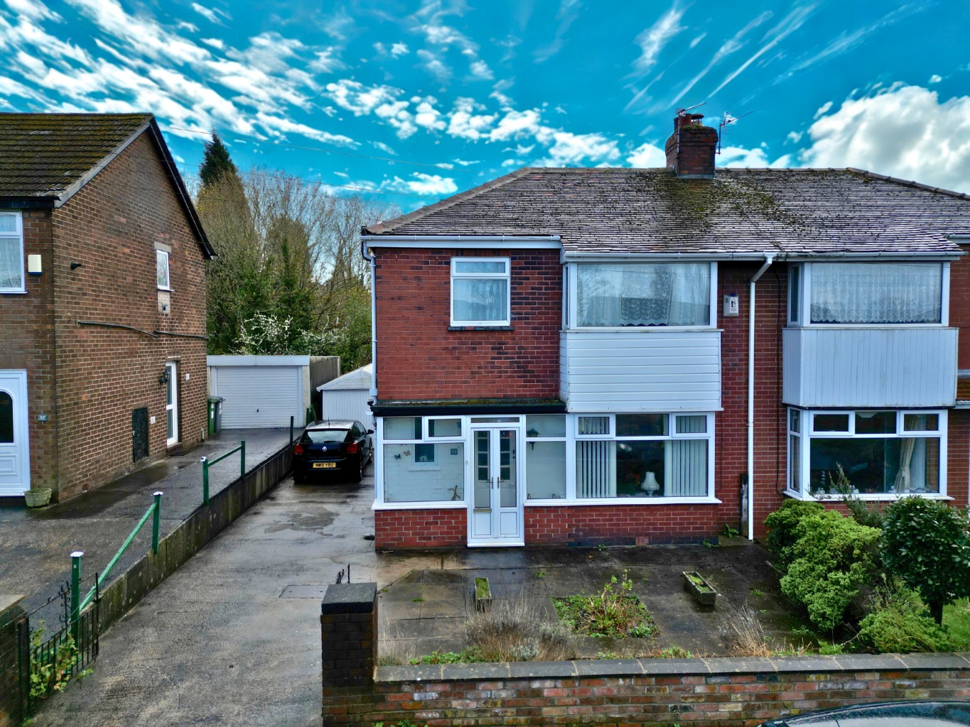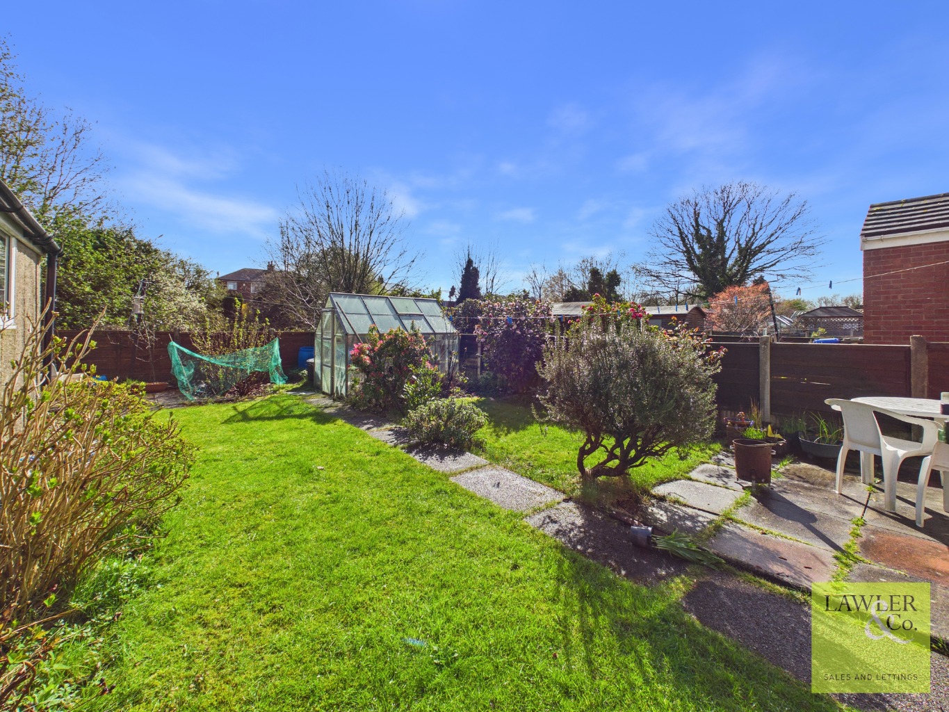 Externally, the home continues to impress with a generous south-facing garden featuring paved seating areas, a central pathway, and lawned sections on either side—perfect for outdoor enjoyment. A detached garage and a driveway providing off-road parking for multiple vehicles add further practicality.