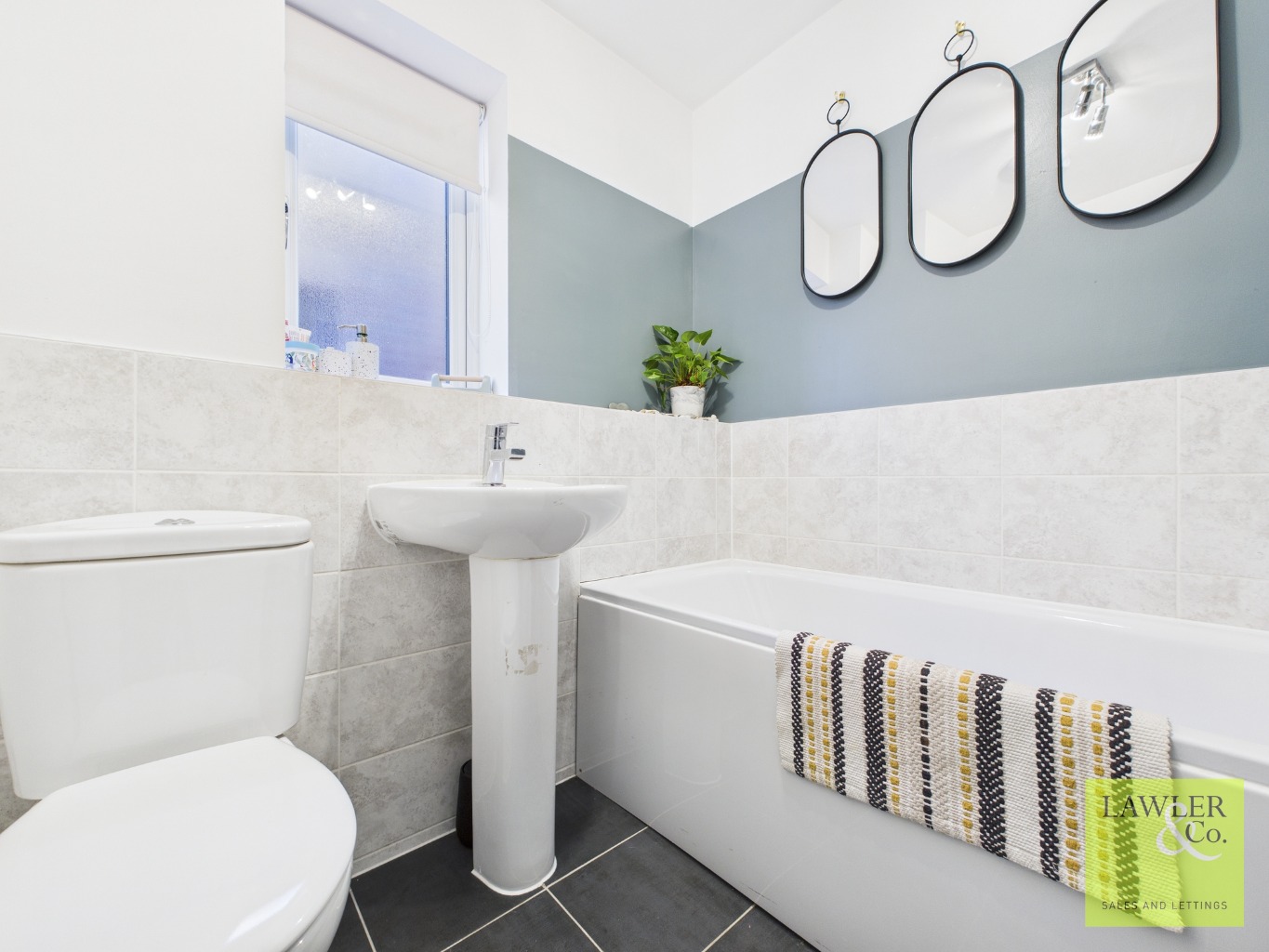 To the first floor, the property offers three well-proportioned bedrooms, comprising a beautiful king sized bedroom, a spacious double bedroom and a single. The main bedroom benefits from a contemporary three-piece en-suite bathroom, complete with hand wash basin, WC and walk-in shower. A modern three-piece family bathroom serves the remaining bedrooms and includes a hand wash basin, WC and bathtub.