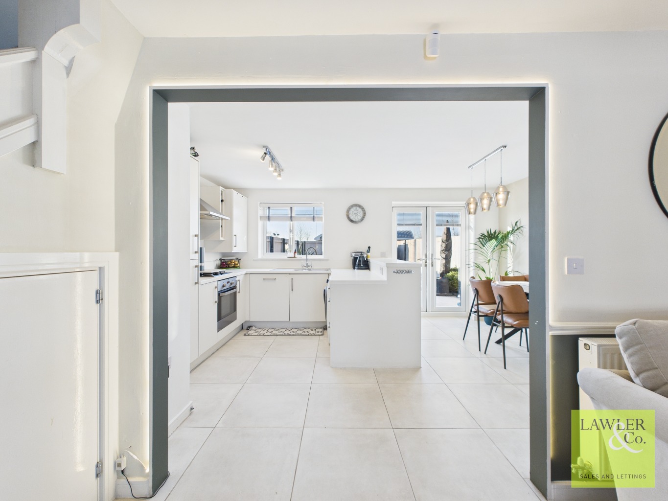 Moving through to the heart of the home, the ground floor boasts a stylish open-plan kitchen, dining and living area, thoughtfully designed to maximise space and natural light. The modern kitchen is fully fitted with integrated appliances, including a fridge/freezer, dishwasher and oven, offering both practicality and a sleek, streamlined finish. This open-plan layout creates an inviting environment, perfect for both relaxing and entertaining.