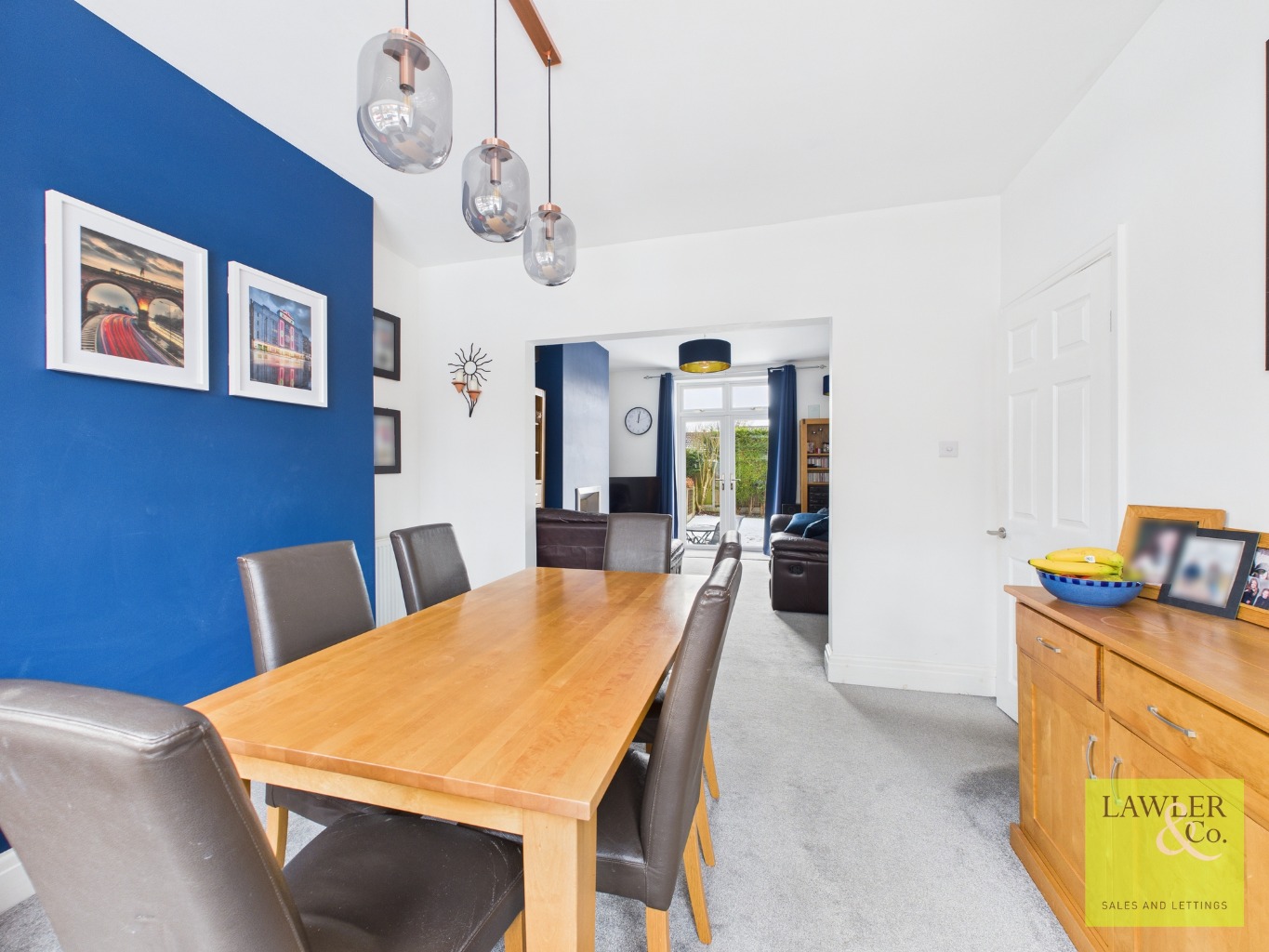 The property welcomes you into a bright and inviting hallway, which leads to a useful downstairs WC with wash basin and houses the central heating boiler. The spacious through lounge and dining room provides an ideal family living space, featuring a modern living flame gas fire, an attractive bay window to the front, and French doors opening onto the rear garden.