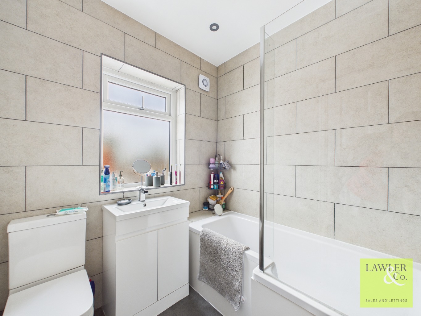 To the first floor are three bedrooms, comprising two doubles and a single bedroom, along with a modern and well-designed family bathroom. The bathroom features a P-shaped bath with shower over and glass screen, a rectangular vanity sink unit, WC, and a heated towel rail, and is fully tiled with complementary finishes. The loft is boarded and benefits from pull-down ladders for easy access.