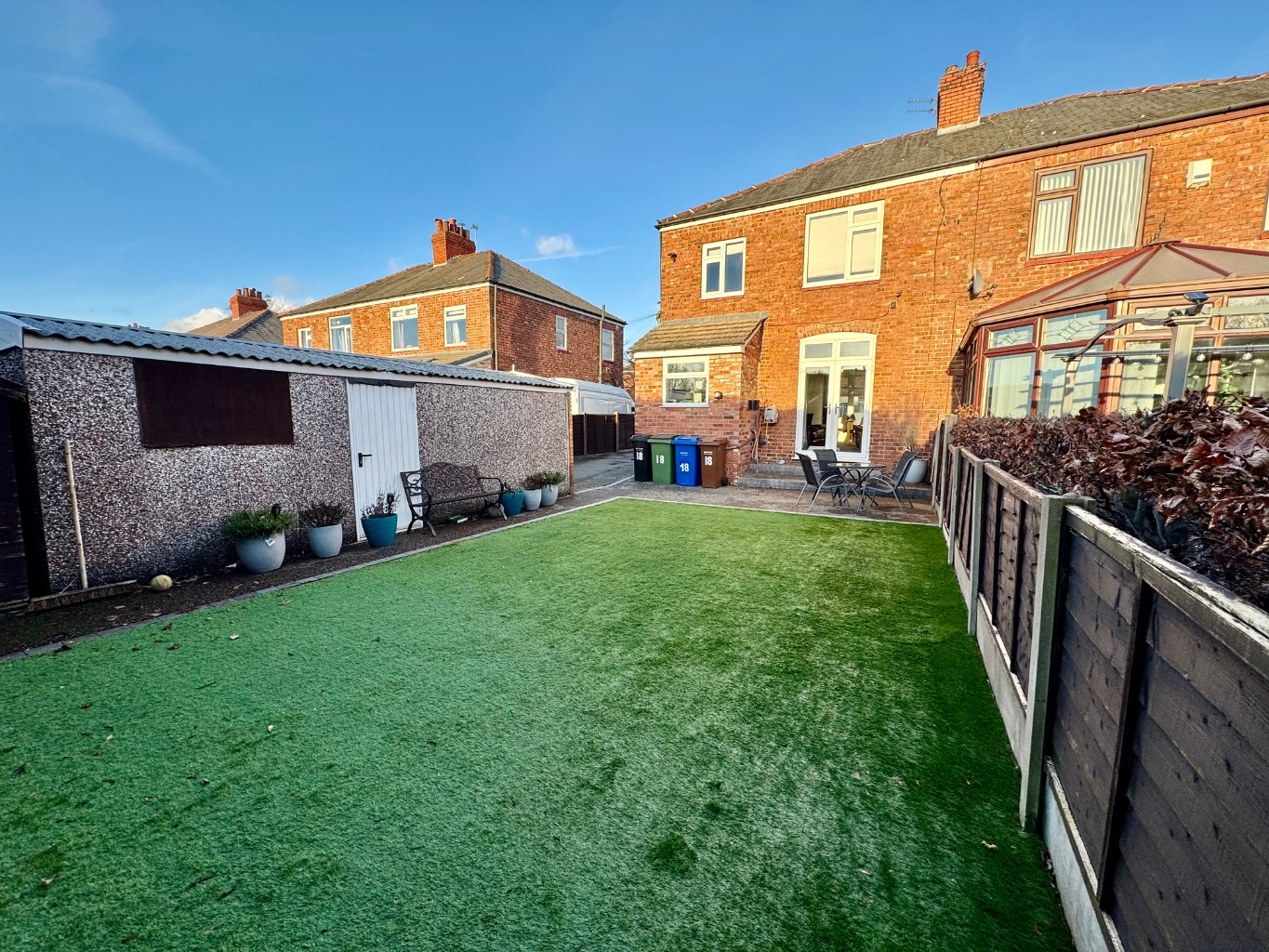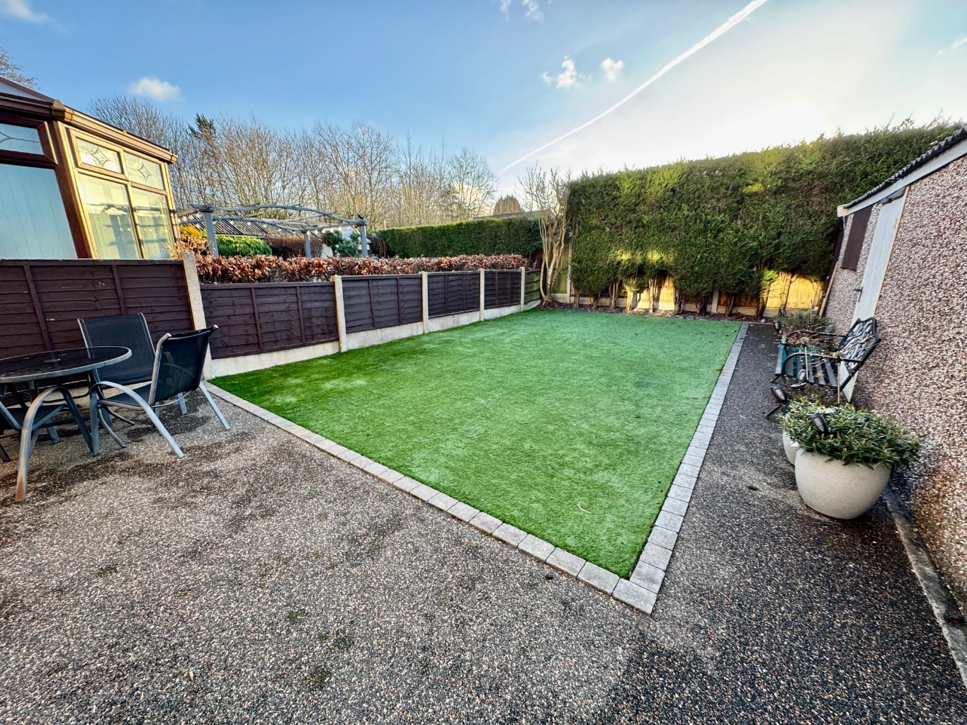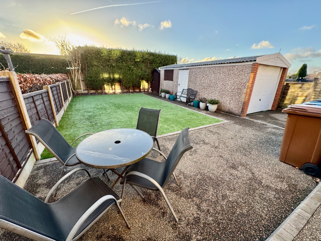 Externally, the property enjoys a private south-facing garden with patio seating area, storage shed, and a low-maintenance artificial lawn. The detached garage offers an up-and-over door to the front, internal lighting, and a useful side access door. Additional outside power points are available to both the front and rear of the property.