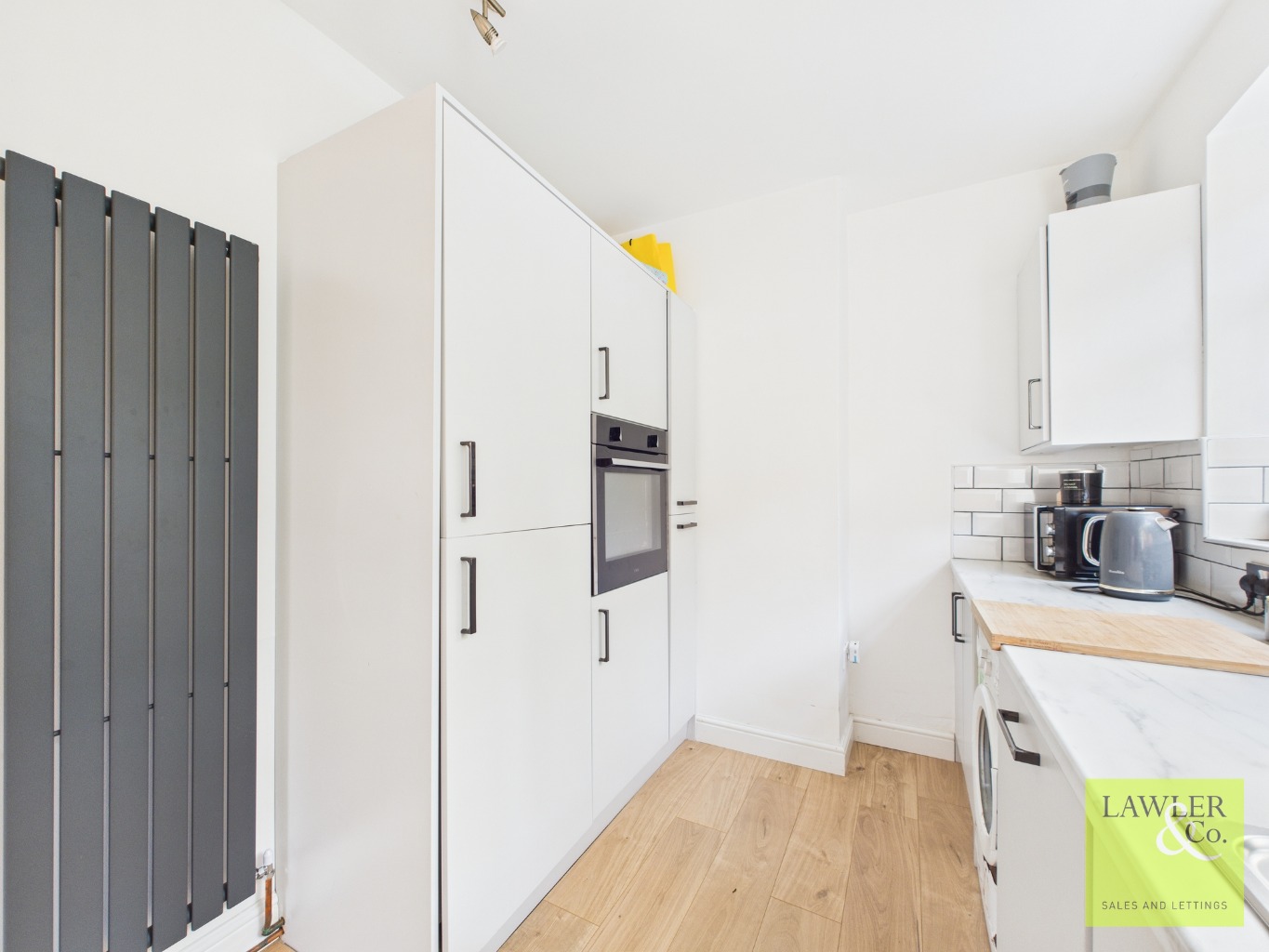 To the rear, the impressive full-width kitchen has been thoughtfully designed and fitted with a comprehensive range of stylish wall and base units complemented by contemporary work surfaces. Integrated appliances include an oven, hob, extractor, dishwasher, fridge and freezer. A side access door leads directly out to the rear garden, enhancing the sense of light and indoor-outdoor flow.