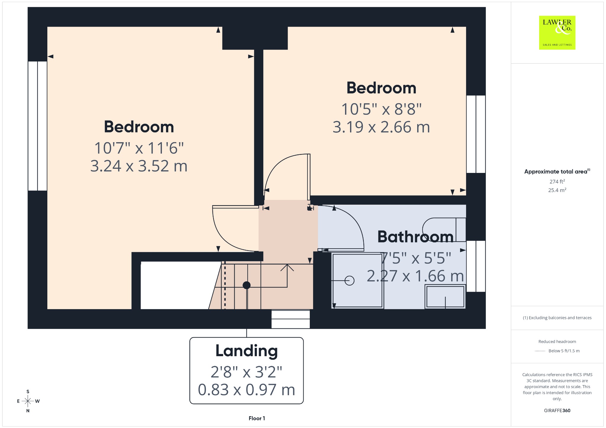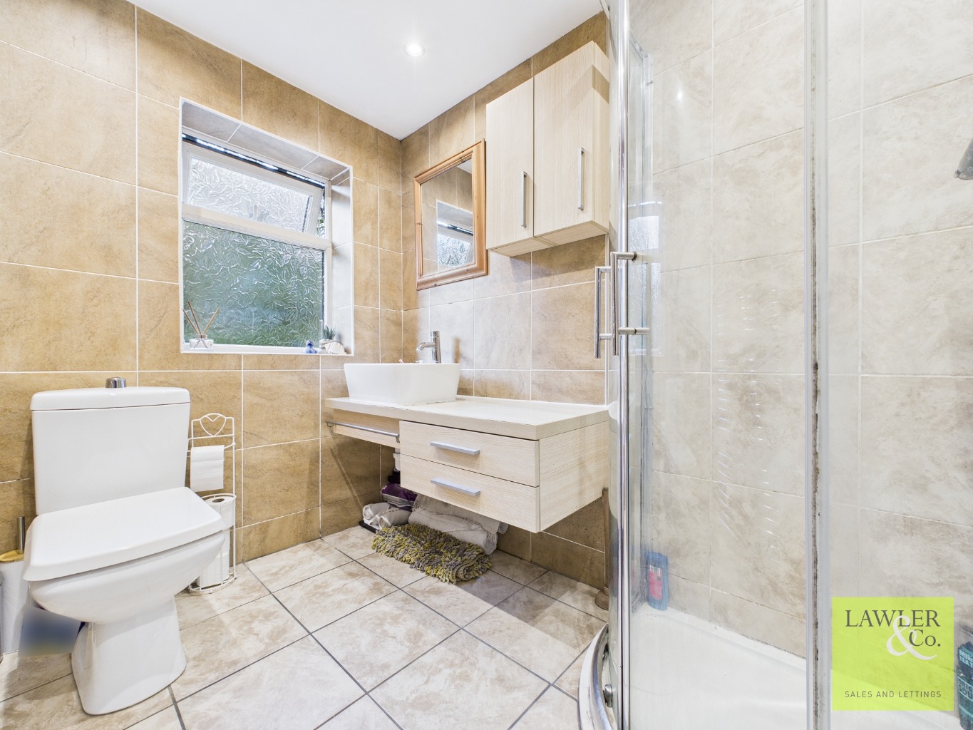The first floor hosts two well-proportioned double bedrooms, both tastefully presented and offering comfortable, versatile living space. The modern bathroom is fitted with a sleek shower enclosure, vanity wash basin and low-level WC, completing the accommodation.