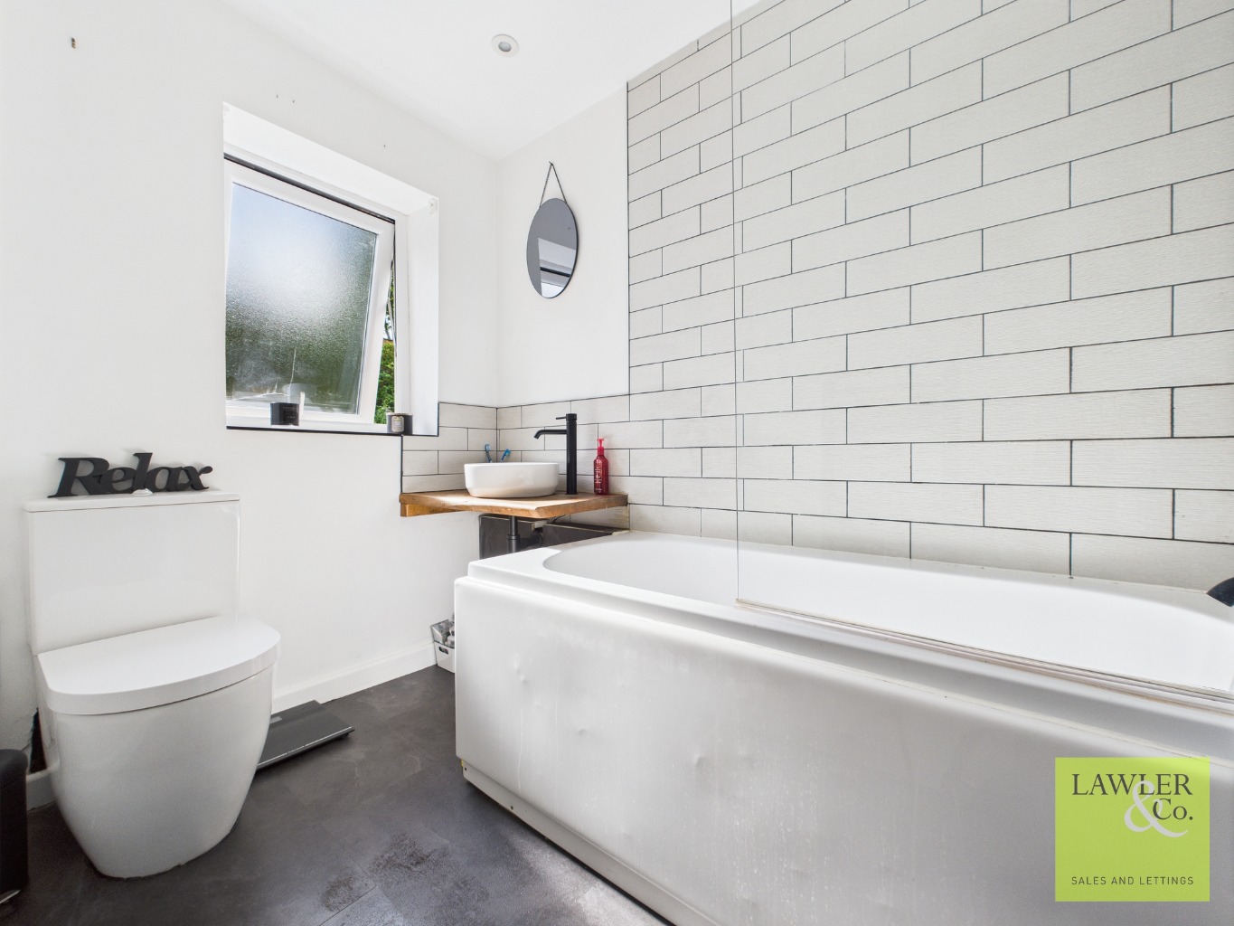 Upstairs, you’ll find two generously sized double bedrooms, each beautifully finished and ready to move into. The contemporary bathroom includes a panelled bath with shower over, modern vanity unit with hand wash basin, and low-level WC. Throughout, the home benefits from PVC double glazing and gas central heating, ensuring comfort and efficiency year-round.