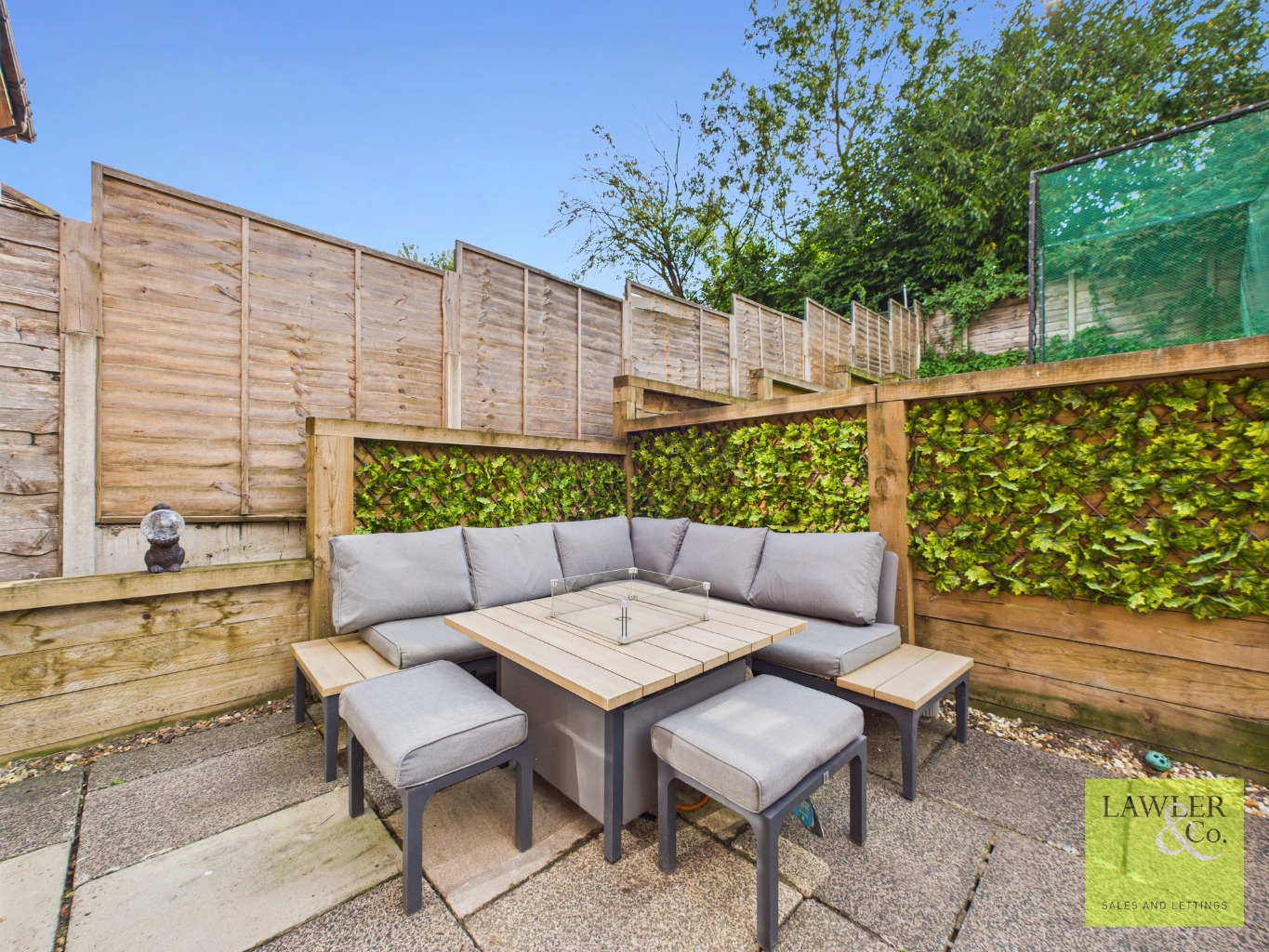 Outside, the front of the property offers a double driveway providing off-road parking for two vehicles. To the rear, a landscaped tiered garden awaits — complete with modern sleepers, faux-grass tiers, and a stylish patio area, ideal for summer BBQs or relaxing evenings under the stars.