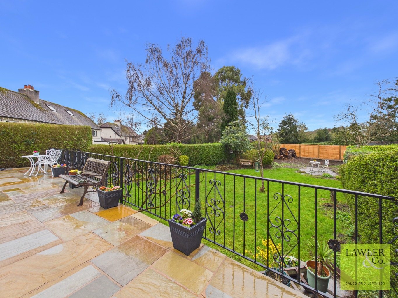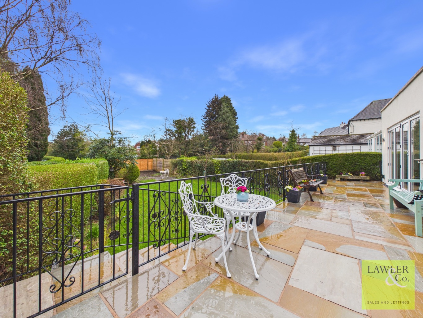 Externally to the rear of the property is a beautiful patio area, creating an ideal space for outdoor seating and summer entertaining. This steps down onto a substantial lawn with an additional patio area. To the side of the property, the garage can be accessed, providing useful storage space. At the front of the property, there is ample parking for multiple vehicles, along with a paved stone walkway leading to the main entrance.
