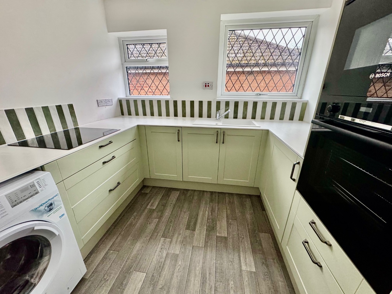 This wonderful home enters into a spacious hallway and has two bedrooms to the front and one bedroom to the rear. The modern kitchen has a range of sage green units with complementary splashback tiling and incorporates an integrated BOSCH electric oven, combination microwave, fridge freezer and electric hob and plumbing for a washing machine.