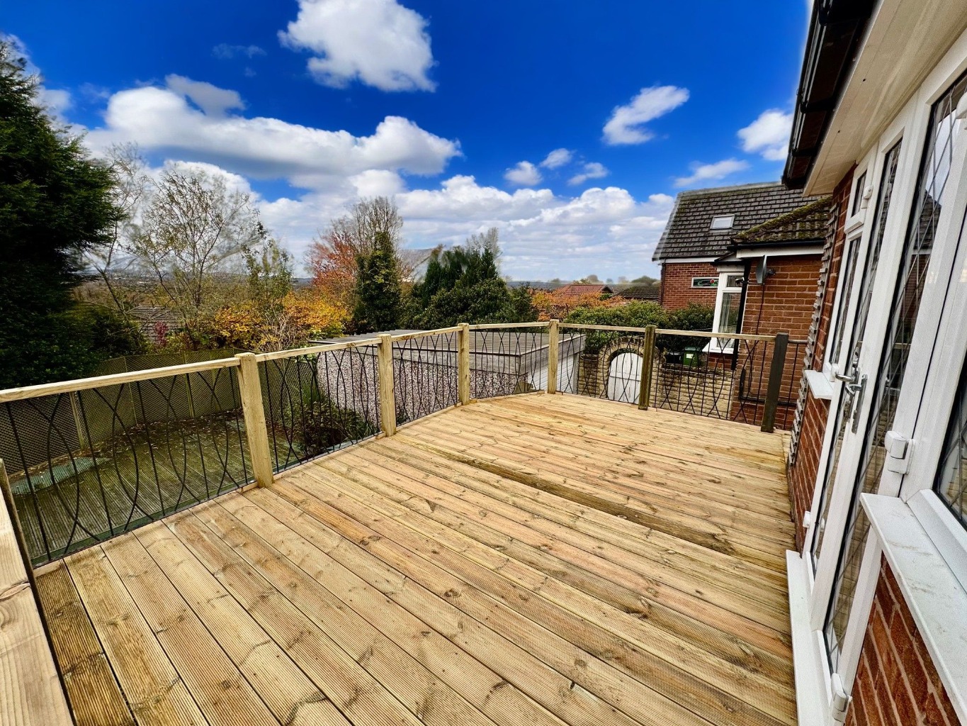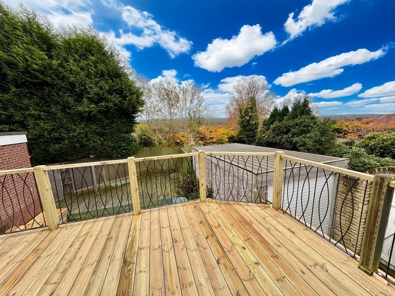 The garden has steps downs to a lawned area and another decked patio for sitting. There is a handy detached garage with electric roll up door and side access and benefits from light and heating so could be used as an office or workshop. There is also extra useful storage under the decked balcony.