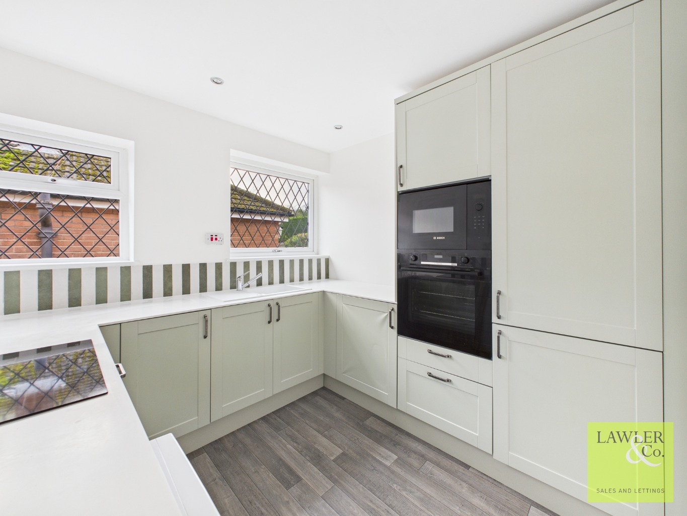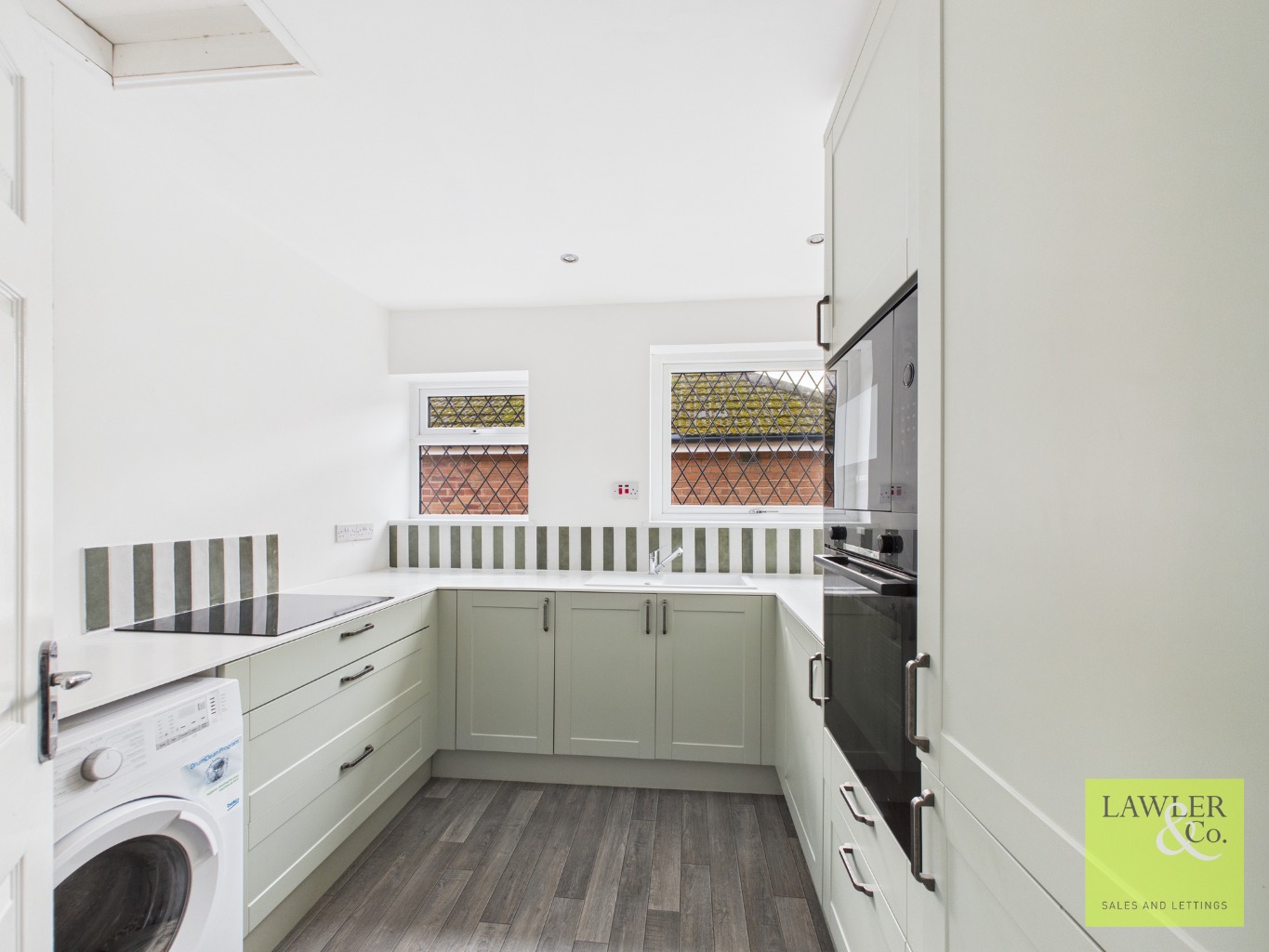 This wonderful home enters into a spacious hallway and has two bedrooms to the front and one bedroom to the rear. The modern kitchen has a range of sage green units with complementary splashback tiling and incorporates an integrated BOSCH electric oven, combination microwave, fridge freezer and electric hob and plumbing for a washing machine.
