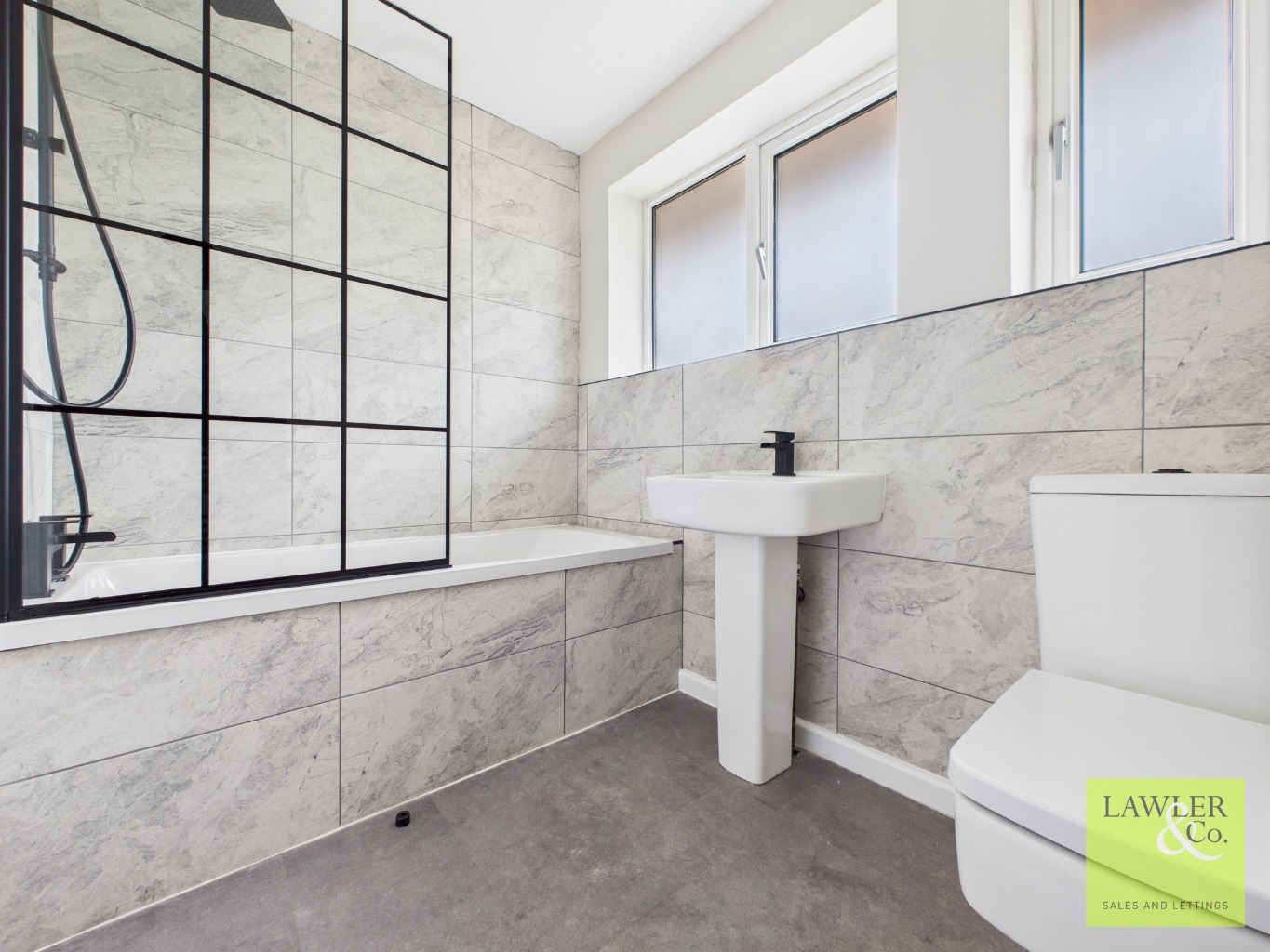Upstairs, the property offers two well-proportioned double bedrooms and a comfortable single bedroom, which includes built-in storage. The stylish bathroom is finished to a modern standard and includes a bath with shower over, hand wash basin, and WC.