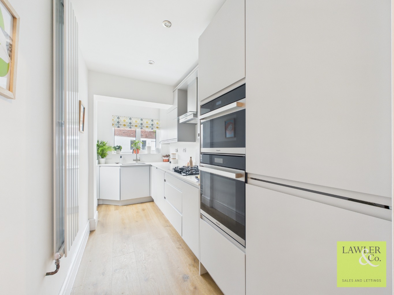 The separate kitchen is fitted with a range of modern eye and base-level units, integrated appliances, and offers a functional and stylish cooking space.
