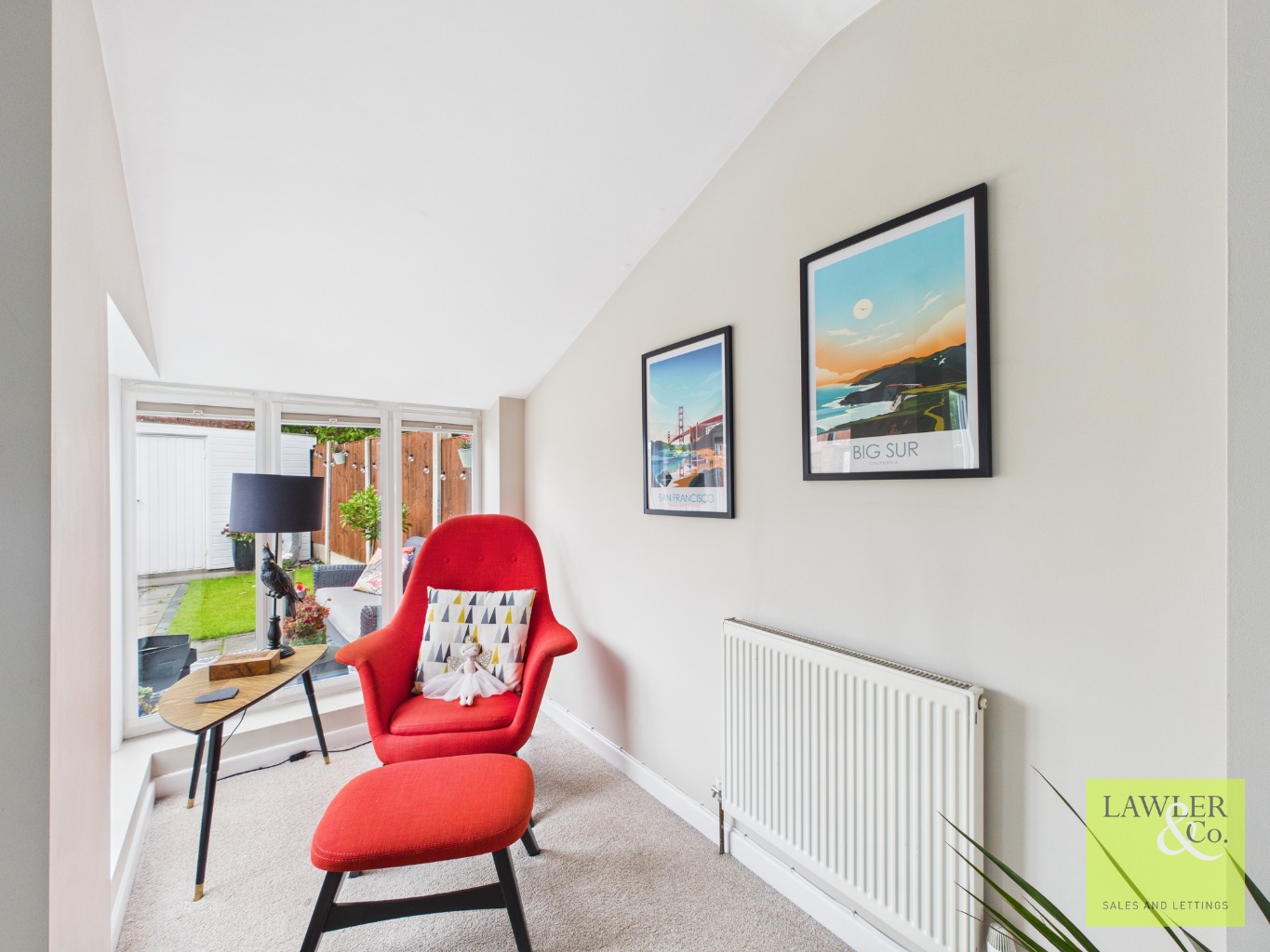 Upon entering, you’re greeted by a warm and inviting hallway with a staircase and handy understairs storage. The ground floor boasts two spacious reception rooms: a formal dining room with a charming bay window to the front, and a separate living room to the rear. Bi-folding doors allow the rooms to be opened up or separated as needed, offering flexible living. The living room is enhanced by a traditional feature fireplace and has been extended to include a cosy reading nook with garden views and patio doors leading outside.