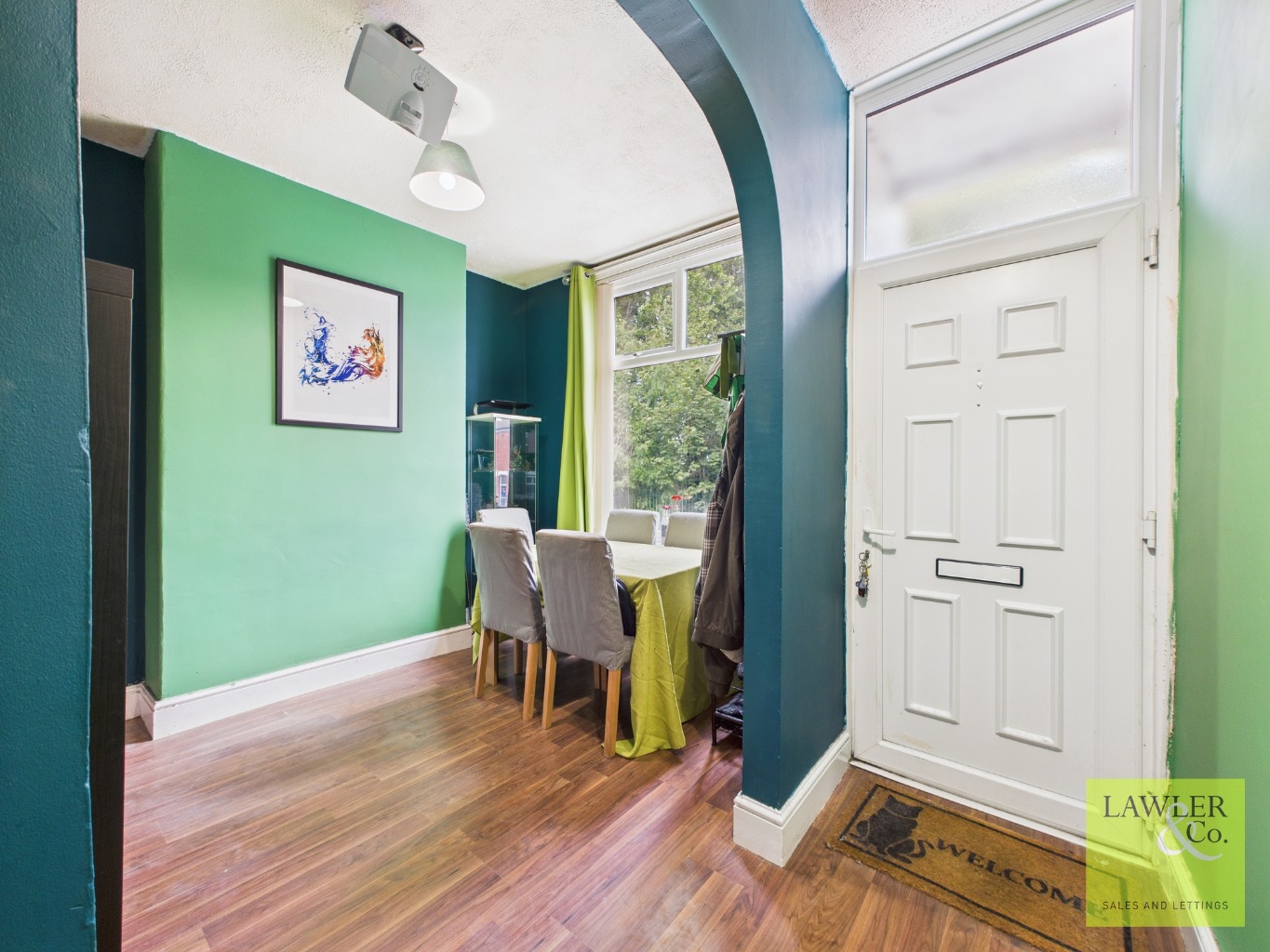 Step inside and discover two generous reception rooms that offer versatile living space. The front room, currently used as a dining area, welcomes you in with warmth and light and a concealed staircase leading to useful cellar chambers, ideal for storage or future development, while the second lounge offers a more relaxed setting and includes a feature fireplace with entrance to the kitchen.