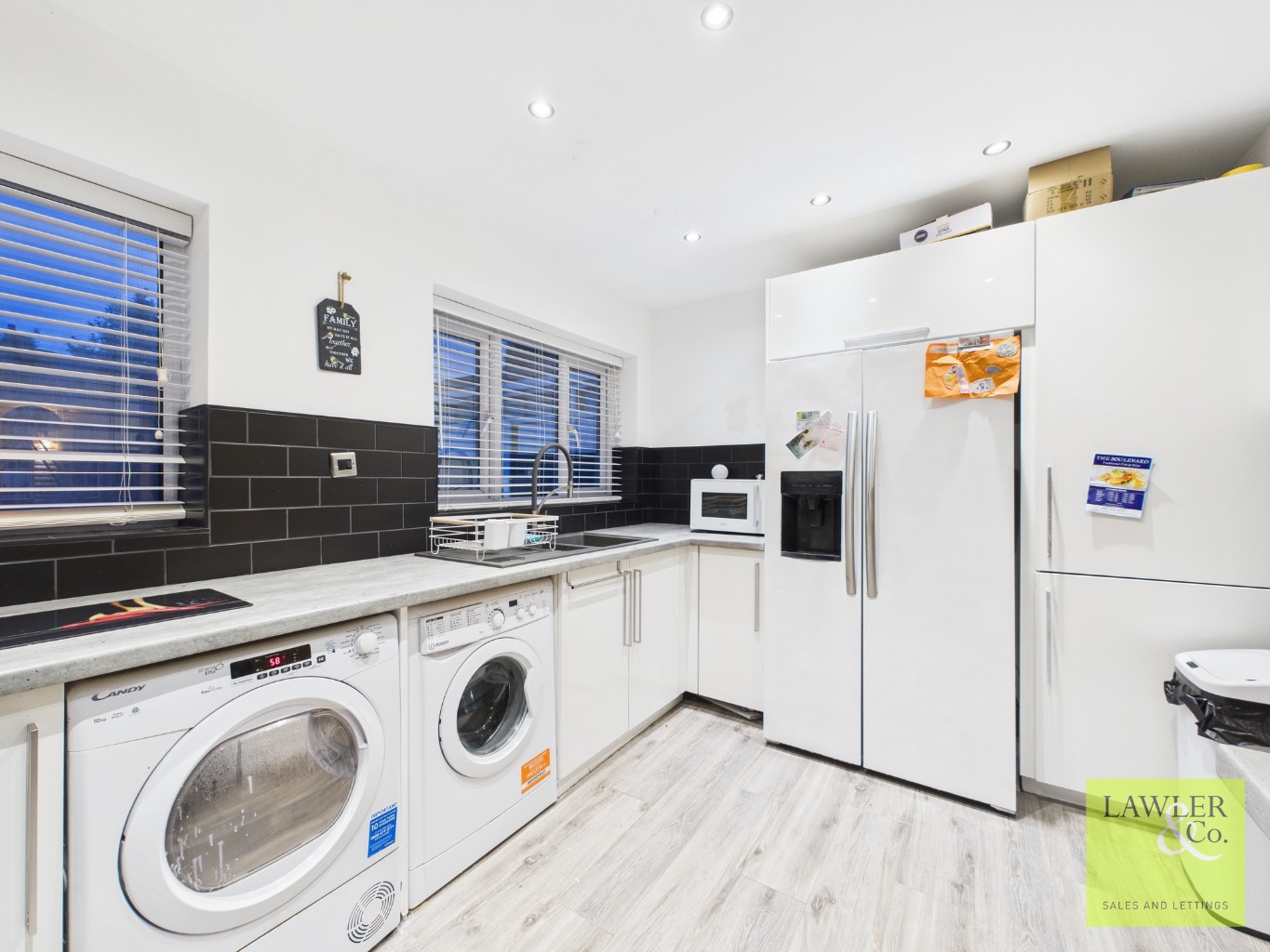 Off the dining area is a modern kitchen offering a range of eye and base level units, an integrated oven and hob, and space for white goods.
