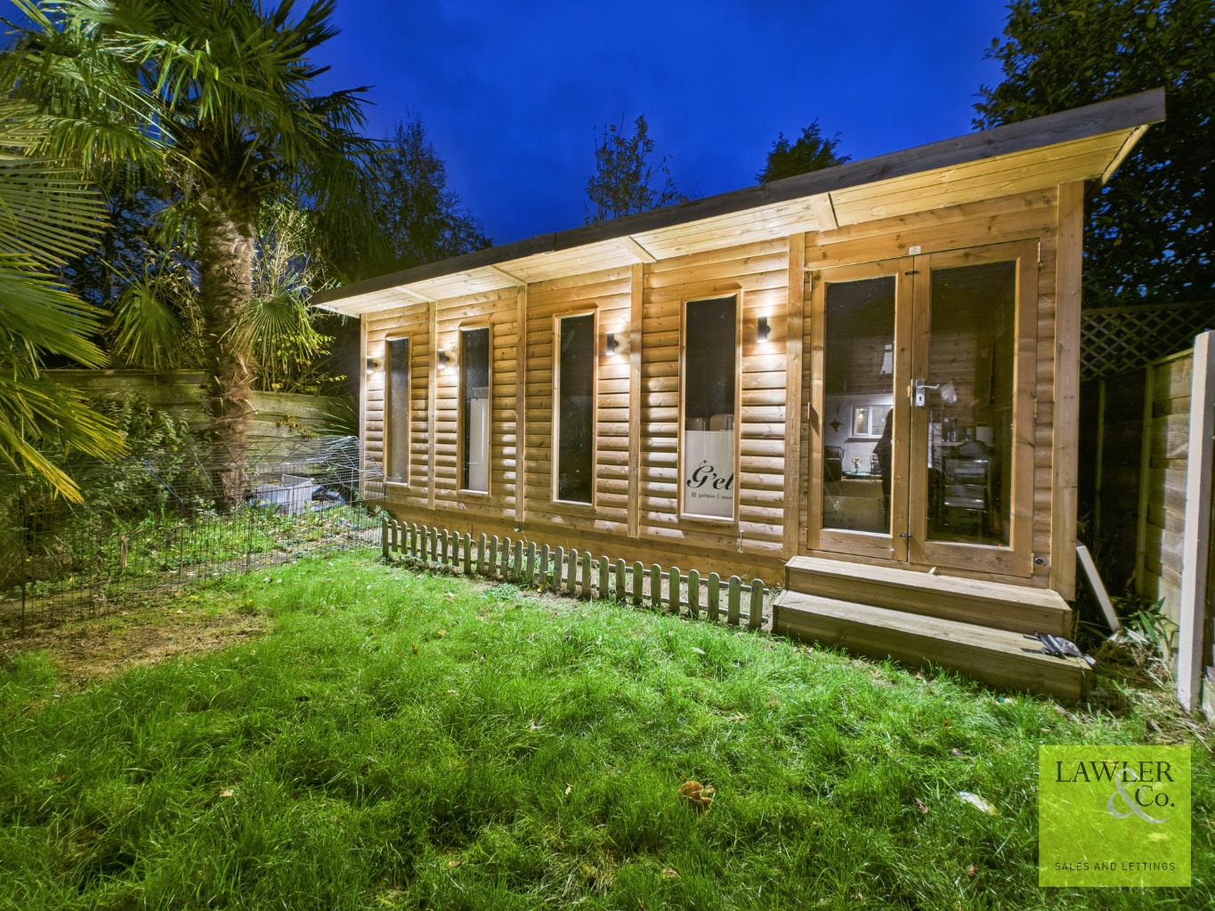 Externally, the rear garden features a paved patio seating area, well-maintained lawn, and an impressive garden office with electricity, perfect for home working or hobbies. To the front, a block-paved driveway provides off-road parking.