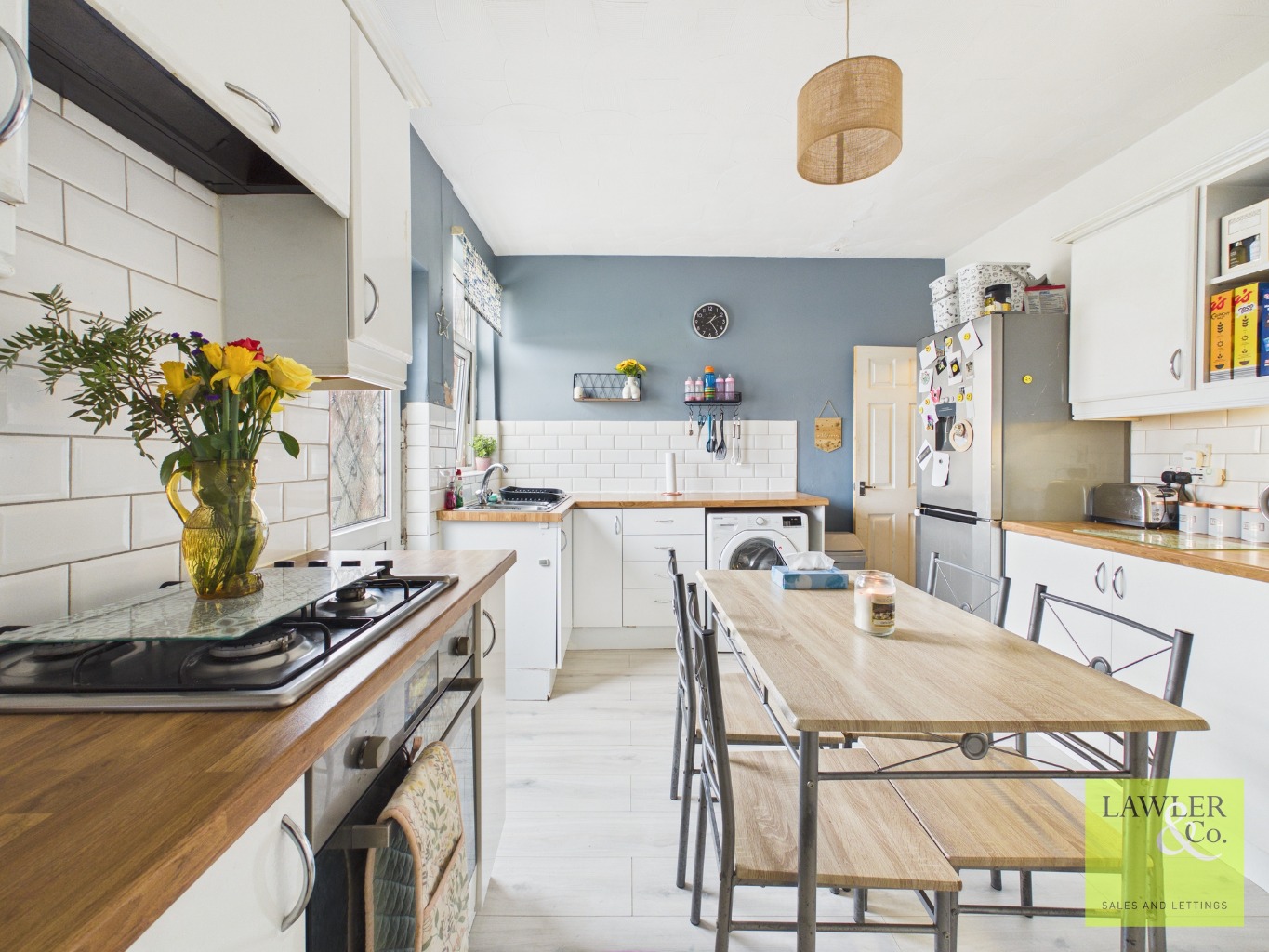 To the rear, you’ll find a kitchen with good storage and workspace, providing a functional area for everyday cooking and dining, with access out to the garden beyond.
