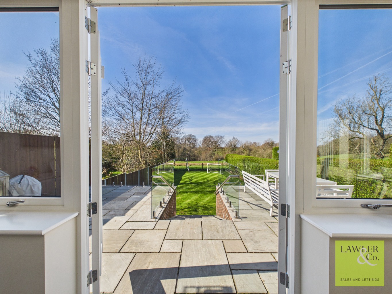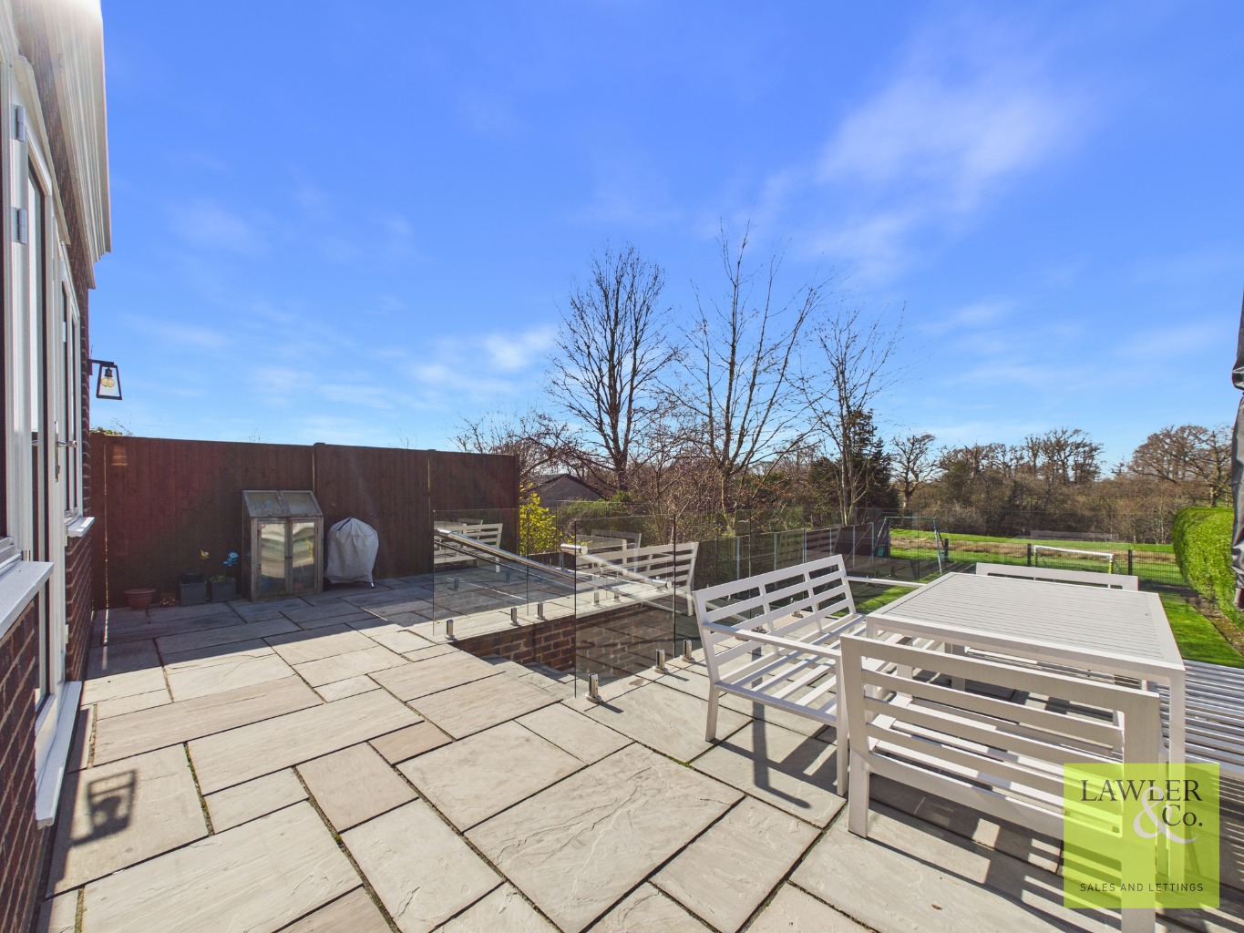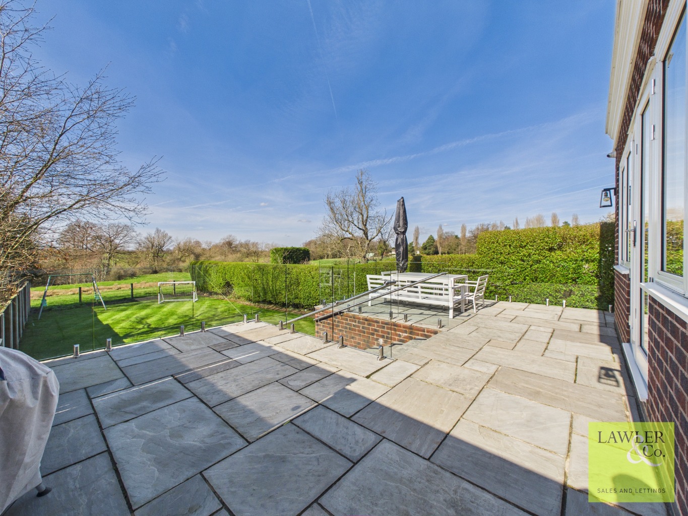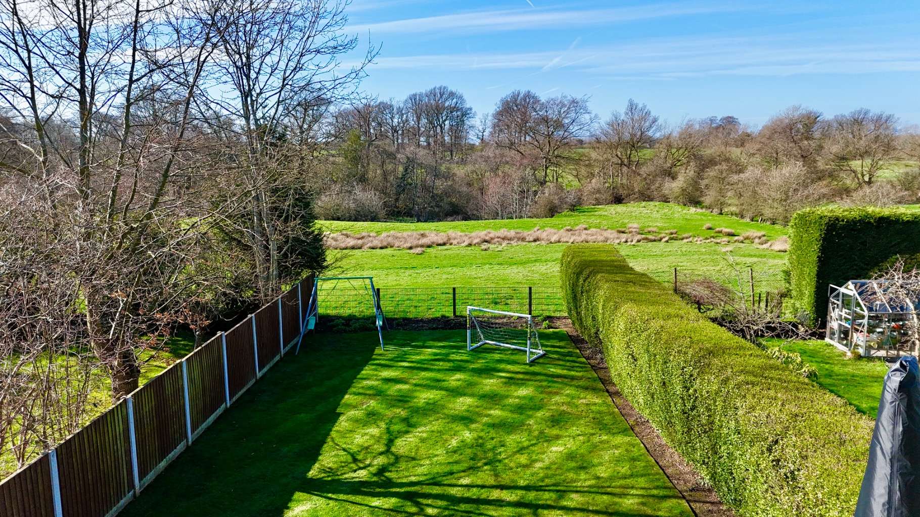 Externally, the property benefits from secure gated access to the front, with generous off-road parking for multiple vehicles. A side gate leads through to the spacious, enclosed rear garden, which enjoys stunning views and a stylish patio with glass balustrades—perfect for outdoor dining and summer entertaining. Steps lead down onto the well maintained lawn, bordered by mature hedges that provide both privacy and an open outlook over the grazing fields beyond.
